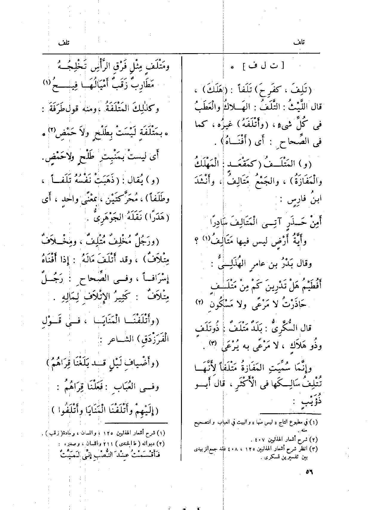 وإِنَّمَا سُمِّيَتِ المَفَازةُ متلفاً مَتْلَفاً لأَنَّهَا تُتْلِفُ سَالِكَها فِي الأَكْثَرِ، قَالَ أَبو ذُؤَيْبٍ: