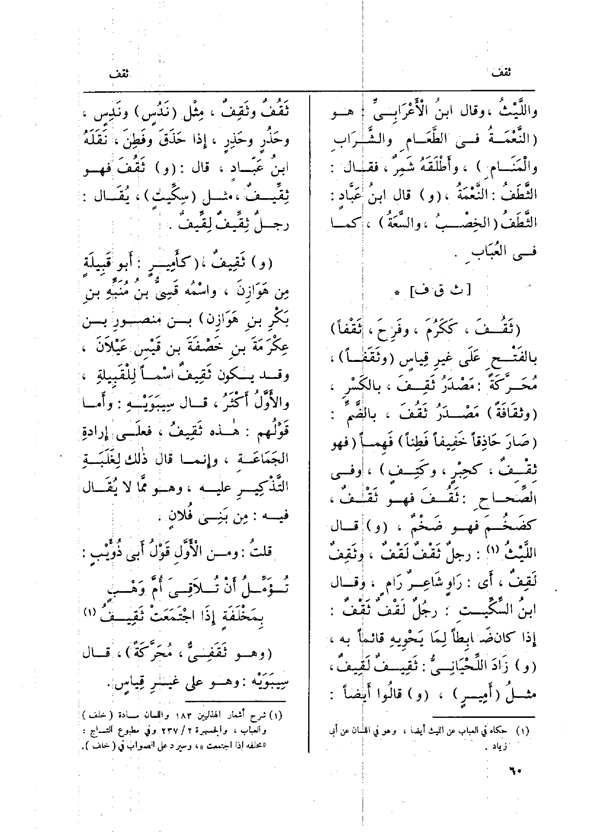 ) ثَقُفَ، كَكَرُمَ، وفَرِحَ، ثَقْفاً بالفَتْحِ عَلَى غيرِ قِياسٍ وثَقَفاً، مُحَرَّكَةً: مَصْدَرُ ثَقْفَ، بالكَسْرِ، وثقَافَةً مَصْدَرُ ثَقُفَ، بِالضَّمِّ: صَارَ حَاذِقاً خَفِيفاً فَطِناً فَهِماً فَهُوَ ثِقْفٌ، كحِبْرٍ، وكَتِفٍ، وَفِي الصِّحاحِ: ثَقُفَ فَهُوَ ثَقْفٌ، كضَخُمَ فَهُوَ ضَخْمٌ، وَقَالَ اللَّيْثُ: رجلٌ ثَقْفٌ لَقْفٌ، وثَقِفٌ لَقِفٌ، أَي: رَاوٍ شَاعِرٌ رَامٍ، وَقَالَ ابنُ السِّكِّتِ: رجُلٌ لَقْفٌ ثَقْفٌ: إِذا كَانَ ضَابِطاً لما يَحْوِيهِ قَائِما بِهِ، زَادَ اللِّحْيَانِيُّ: ثَقِيفٌ لَقِيفٌ، مثلُ أَمِيرٍ، قالُوا أَيضاً: ثُقفٌ وثَقِفٌ، مِثْل نَدُسٍ ونَدِسٍ، وحَذُرٍ وحَذِرٍ، إِذا حَذَقَ وفَطِنَ، نَقَلَهُ ابنُ عَبّادٍ، قَالَ: وثَقُفَ فَهُوَ ثِقِّيفٌ، مثل سِكِّيتِ، يُقَال: رجلٌ ثِقِّيفٌ لِقِّيفٌ. ثَقِيفٌ، مثل سِكِّيتٍ، يُقَال: رجلٌ ثِقِّيف لِقِّيف. ثَقِيفٌ، كأَمِيرٍ: أَبو قَبِيلَةٍ مِن هَوَازِنَ، واسْمُه قَسِىُّ بنُ مُنَبِّهِ بنِ بَكْرِ بنِ هَوَازِن بنِ منصورِ بن عِكْرَمَةَ بنِ خَصْفَةَ بن قَيْسِ عَيْلاَنَ، وَقد يكون ثَقِيفٌ اسْماً لِلْقَبِيلِة، والأَوَّلُ أَكْثَرُ، قَالَ سِيبَوَيْهِ: وأَما قَوْلُهم: هَذِه ثَقِيفُ، فعلَى إِدارةِ الجَماعَةِ، وإِنَّمَا قَالَ ذَلِك لِغَلَبَةِ التَّذْكِيرِ عَلَيْهِ، وَهُوَ مِمَّا لَا يُقَال فِيهِ: مِن بَنِي فُلانٍ.