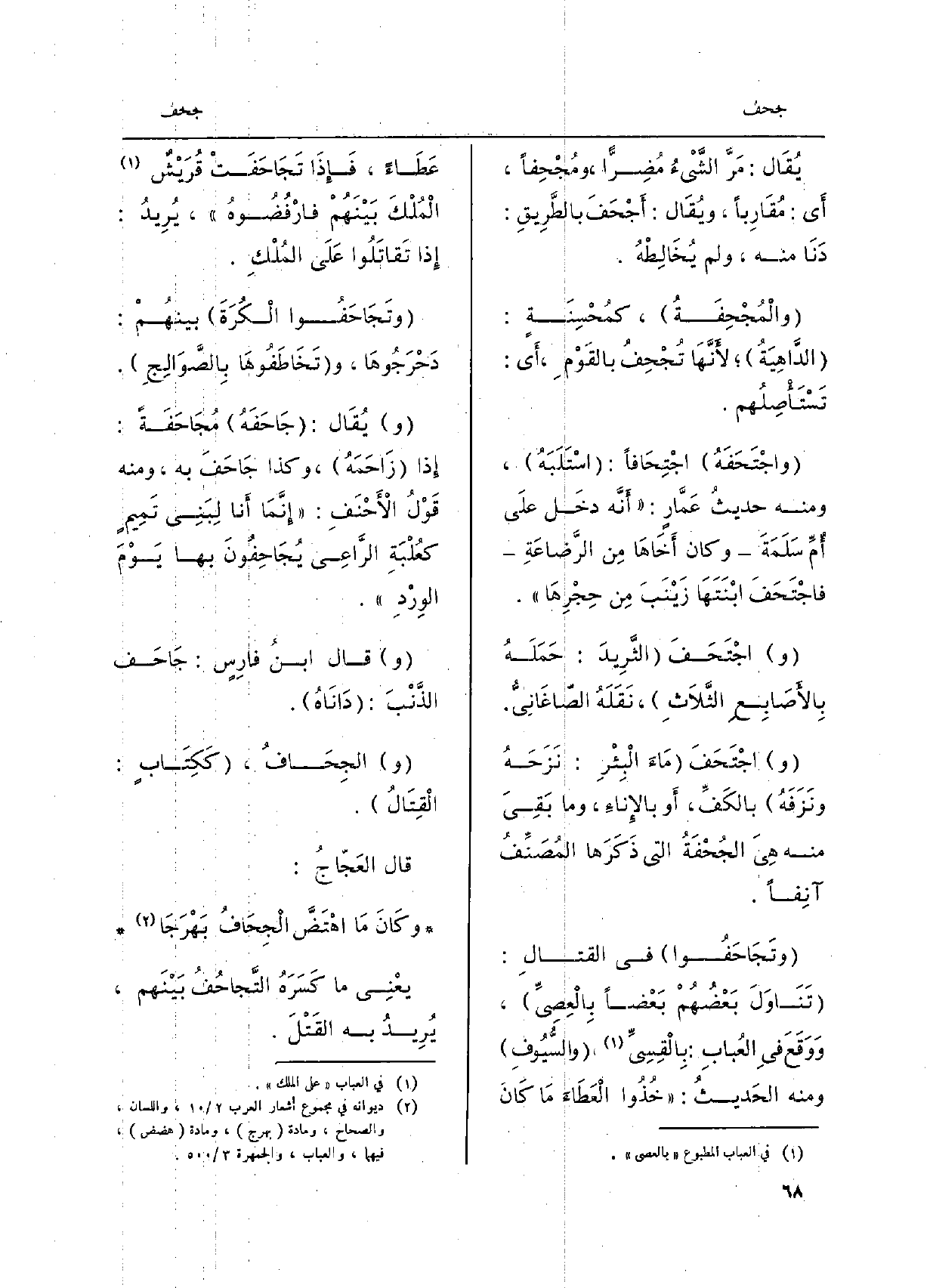 وتَجَاحَفُوا فِي الْقِتَال: تَنَاوَلَ بَعْضُهُمْ بَعْضاً بالْعِصِىَّ، وَوَقَعَ العُبابِ: بِالْقِسِيِّ والسُّيُوفِ وَمِنْه الحَديثُ:) خُذُوا الْعَطَاءَ مَا كَانَ عَطَاءً، فَإِذَا تَجَاحَفَتْ قُرَيْشٌ الْمُلْكَ بَيْنَهُمْ فارْفُضُوهُ، يُرِيدُ: إِذا تَقاتَلُوا عَلَى المُلْكِ.