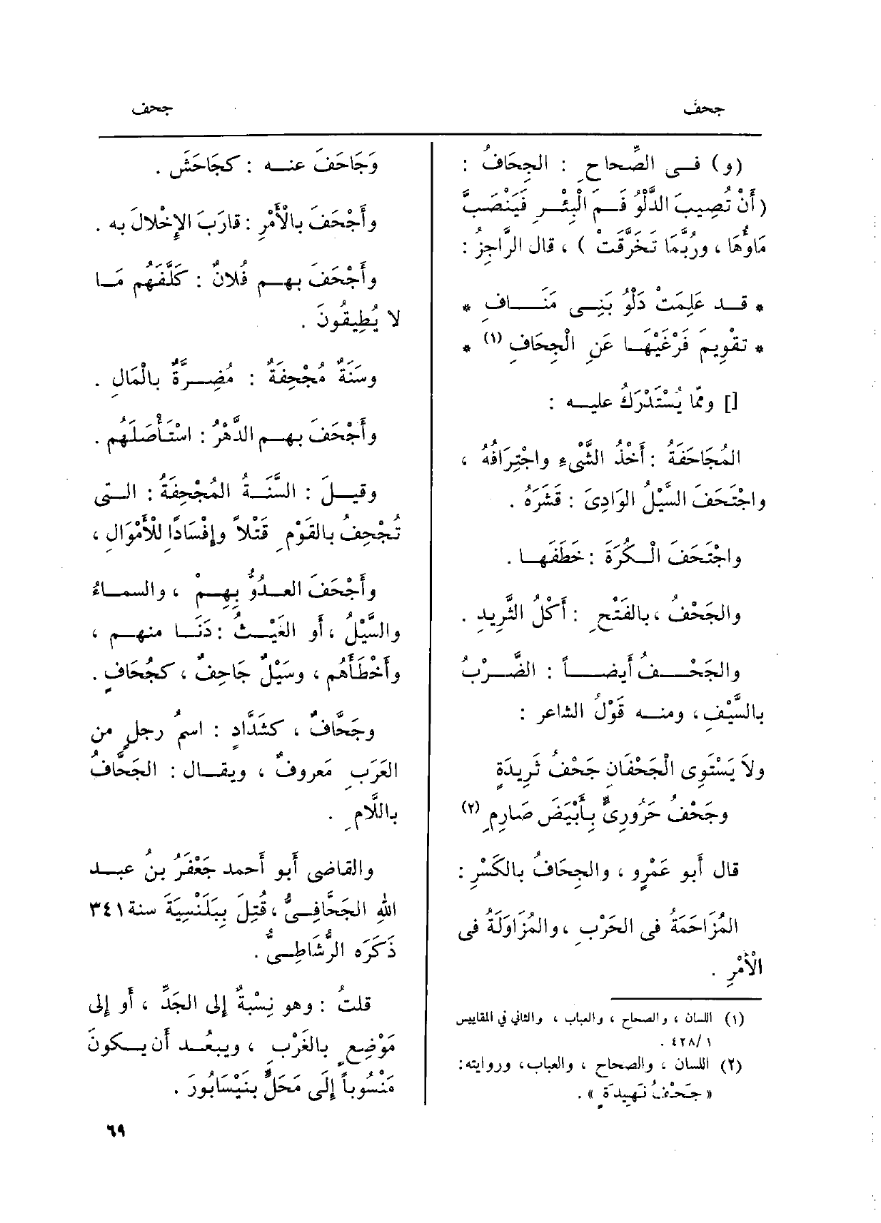 وقيلَ: السَّنَةُ: المُجْحِفَةُ: الَّتِي تُجْحِفُ بالقَوْمِ قَتْلاً وإِفْسَاداً لِلأَمْوَالِ، وأَجْحَفَ العدُوُّ بِهِمْ، والسماءُ والسَّيْلُ، أَو الغَيْثُ: دَنَا مِنْهُم: وأَخْطَأَهُم، وسَيْلٌ جَاحِفٌ، كجُحَافٍ.