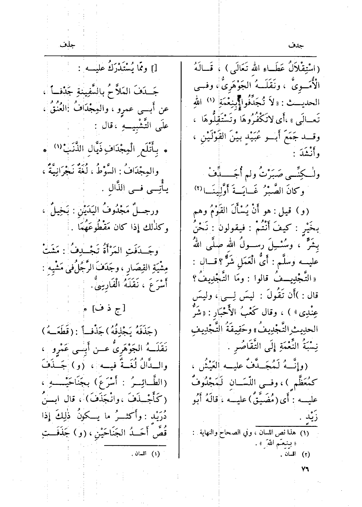 قيل: هُوَ أَنْ يُسْأَلَ القَوْمُ وهم بِخَيْرٍ: كيفَ أَنْتُمْ: فَيَقُولُونَ: نَحْنُ بِشَرٍّ، وسُئِلَ رسولُ اللهِ صلَّى اللهُ عَلَيْهِ وسلَّم: أَيُّ الْعَمَلِ شَرٌّ قَالَ:) التَّجْدِيفُ قَالُوا: ومَا التَّجْدِيفُ قَالَ: أَن تَقُولَ: ليَس لِي، وليَس عِنْدِي، وَقَالَ كَعْبُ الأَحْبَارِ:) شَرُّ الحِديثِ التَّجْدِيفُ (وحَقِيقَةُ التَّجْدِيفِ نِسْبَةُ النِّعْمَةِ إِلَى)