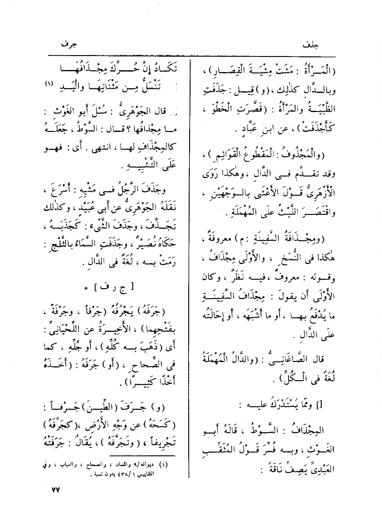 ومِجْذَافَةُ السَّفِينَةِ: م معروفَةٌ، هَكَذَا النُّسَخِ، والأَوْلَى مِجْذَافُ، وَقَوله: معروفٌ، فِيهِ نَظَرٌ، وَكَانَ الأَوْلَى أَن يقولَ: مِجْذَافُ السَّفِينَةِ مَا يُدْفَعُ بهَا، أَو مَا أَشْبَهَه، أَو إِحَالَتُه علَى الدَّالِ.