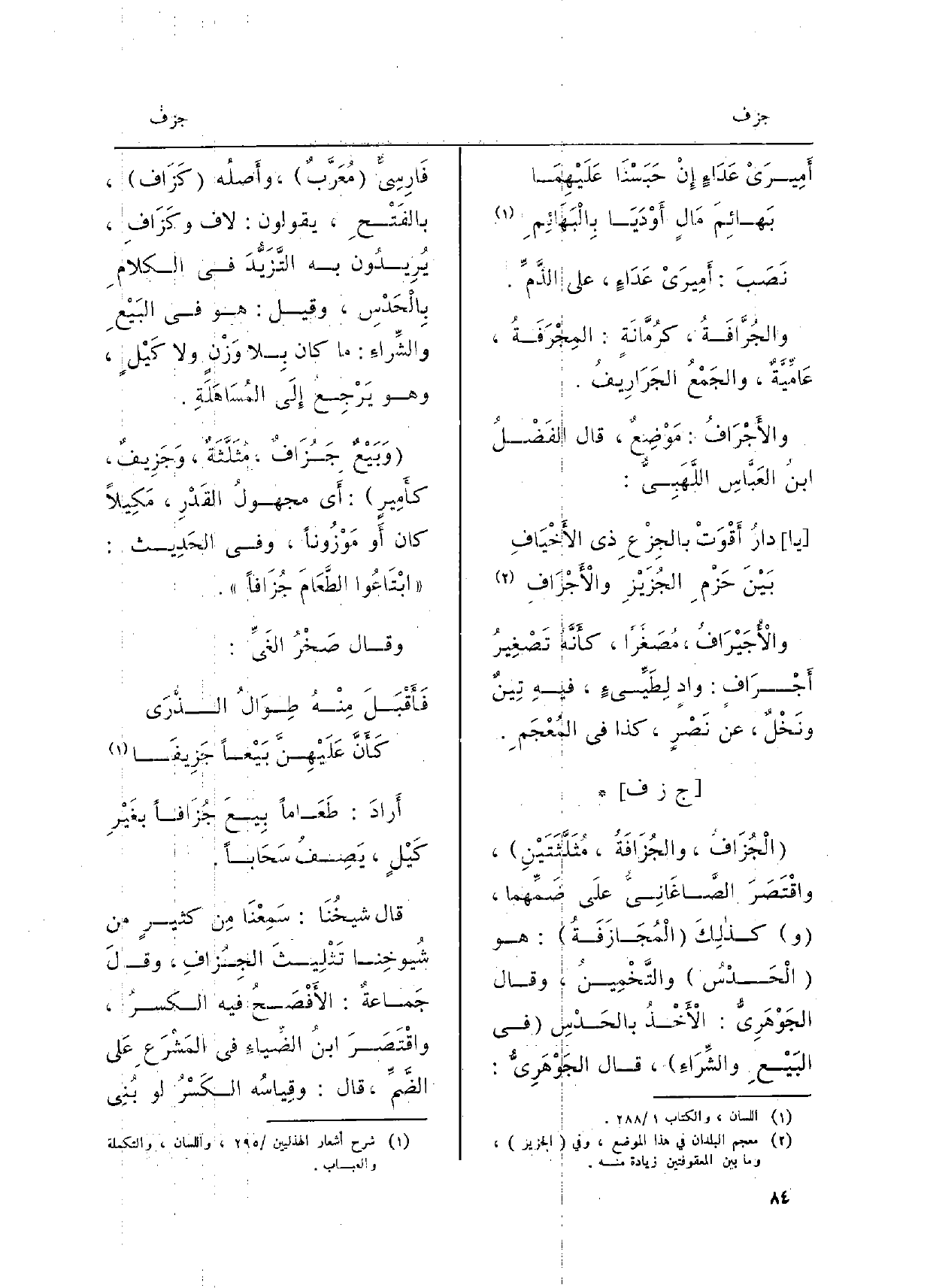 ) الْجُزَافُ، والجُزَافَةُ، مُثَلَّثَتَيْنِ، واقْتَصَرَ الصَّاغَانيُّ علَى ضَمِّهما، كذلِكَ الْمُجَازَفَةُ: هُوَ الْحَدْسُ والتَّخْمِينُ، وَقَالَ الجَوْهَرِيُّ: الأَخْذُ بالحَدْسِ فِي البَيْعِ والشِّرَاءِ، قَالَ الجَوْهَرِيُّ: فَارِسِيُّ مُعَرَّبٌ، وأَصلُه كَزَاف، بالفَتْحِ، يَقُولُونَ: لاف وكَزافِ، يُرِيدُون بِهِ التَّزَيُّدُ فِي الكلامِ بِالْحَدْسِ، وَقيل: هُوَ فِي البَيْعِ والشِّراءِ: مَا كَانَ بِلا وَزْنٍ وَلَا كَيْلٍ، وَهُوَ يَرْجِعُ إِلَى المُسَاهَلَةِ. وَبَيْعٌ جَزُافٌ، مُثَلَّثَةٌ، وَجَزِيفٌ، كأَمِيرٍ: أَي مجهولُ القَدْرِ، مَكِيلا كَانَ أَو مَوْزُوناً، وَفِي الحَدِيث:) ابْتَاعُوا الطَّعَامَ جُزَافاً (.