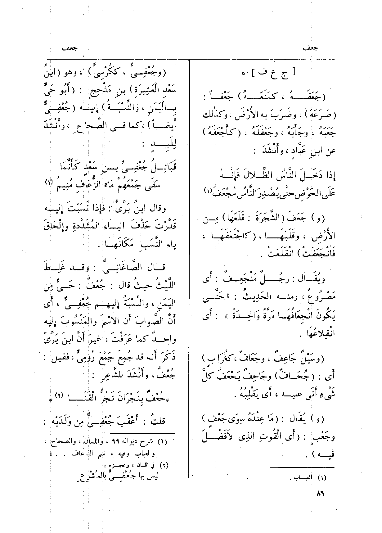 قَالَ الصَّاغَانِيُّ: وَقد غَلِطَ اللَّيْثُ حيثُ قَالَ: جُعْفٌ: حَيٌّ مِن اليَمَنِ، والنِّسْبَةُ إِليهم جُعْفِيٌّ، أَي أَنَّ الصَّوابَ أَن الاسْمَ والمَنْسُوبَ إِليه واحدٌ كَمَا عَرَفْتَ، غيرَ أَنَّ ابنَ بَرِّيّ ذَكَرَ أَنه قد جُمِعَ جَمْعَ رُومِيٍّ، فَقيل: جُعْفٌ، وأَنْشَدَ للشَّاعِرِ: جُعْفٌ بِنَجْرَانَ تَجُرُّ الْقَنَا قلتُ أَعْقَبَ جُعْفِيٌّ مِن وَلَدَيْه: