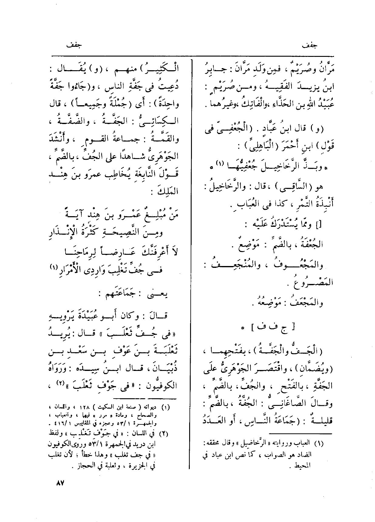 يَعْنِي: جَمَاعَتَهم: قَالَ: وَكَانَ أَبو عُبَيْدَةَ يَرْوِيهِ) فِي جٌ فِّ ثَعْلَبَ (قَالَ: يُرِيدُ ثَعْلَبَةَ بنَ عَوْفِ بن سَعْدِ بن ذُبْيَانَ، قَالَ ابنُ سِيدَه: وَرَوَاهُ الكوفيُّون:) فِي جَوْفِ ثَعْلَبَ (،