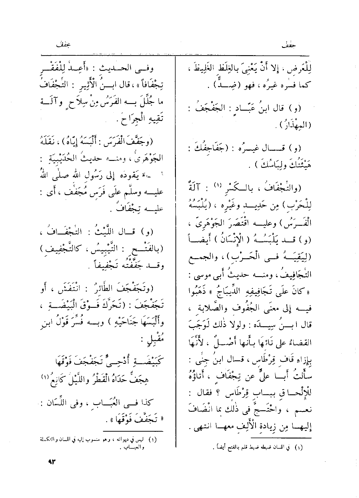 } والتِّجْفَافُ، بالكَسْرِ: آلَةٌ لِلْحَرْبِ مِن حَدِيد وغَيْرِه، يُلْبَسُهُ الْفَرَسُ وَعَلِيهِ اقْتصر الجَوْهَرِيُّ، قد يَلْبَسُهُ الإِنْسَانُ أَيضاً لِيَقِيَهُ فِي الْحَرْبِ، وَالْجمع {التجَافِيفُ، وَمِنْه حديثُ أَبِي مُوسَى:) كانَ علَى} تَجَافِيفِهِ الديِّبَاجُ (ذَهَبُوا فِيهِ إِلَى معنَى {الجُفُوفِ والصَّلابِة، قَالَ ابنُ سِيدَه: وَلَا لَا ذَلِك لَوَجَبَ القضاءُ على تَائِهَا بأَنَّهَا أَصْلٌ، لأَنَّهَا بإِزاءِ قافِ قِرْطَاس، ِ قَالَ ابنُ جِنِّي: سأَلتُ أَبا عليٍّ عَن} تِجْفَافٍ، أَتاؤُهُ لْلإِلْحاقِ ببابِ قِرْطَاسٍ فَقَالَ نعم، واحٍ تَجَّ فِي ذَلِك بِمَا انْضَافَ إِليها مِن زِيادةِ الأَلِفِ مَعهَا انْتهى.