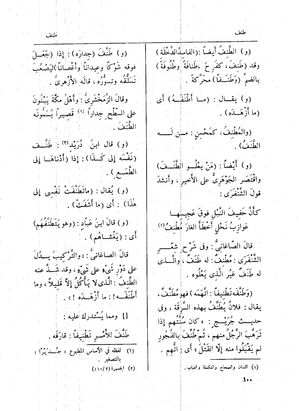 قالَ الصاغانِيُّ: وَفِي شرْحِ شِعْرِ الشَّنْفَرَي: مُطْنِفٌ: لَهُ طَنَفٌ، والَّذِي لَهُ طَنَفٌ غيرُ الَّذِي يَعْلُوه.