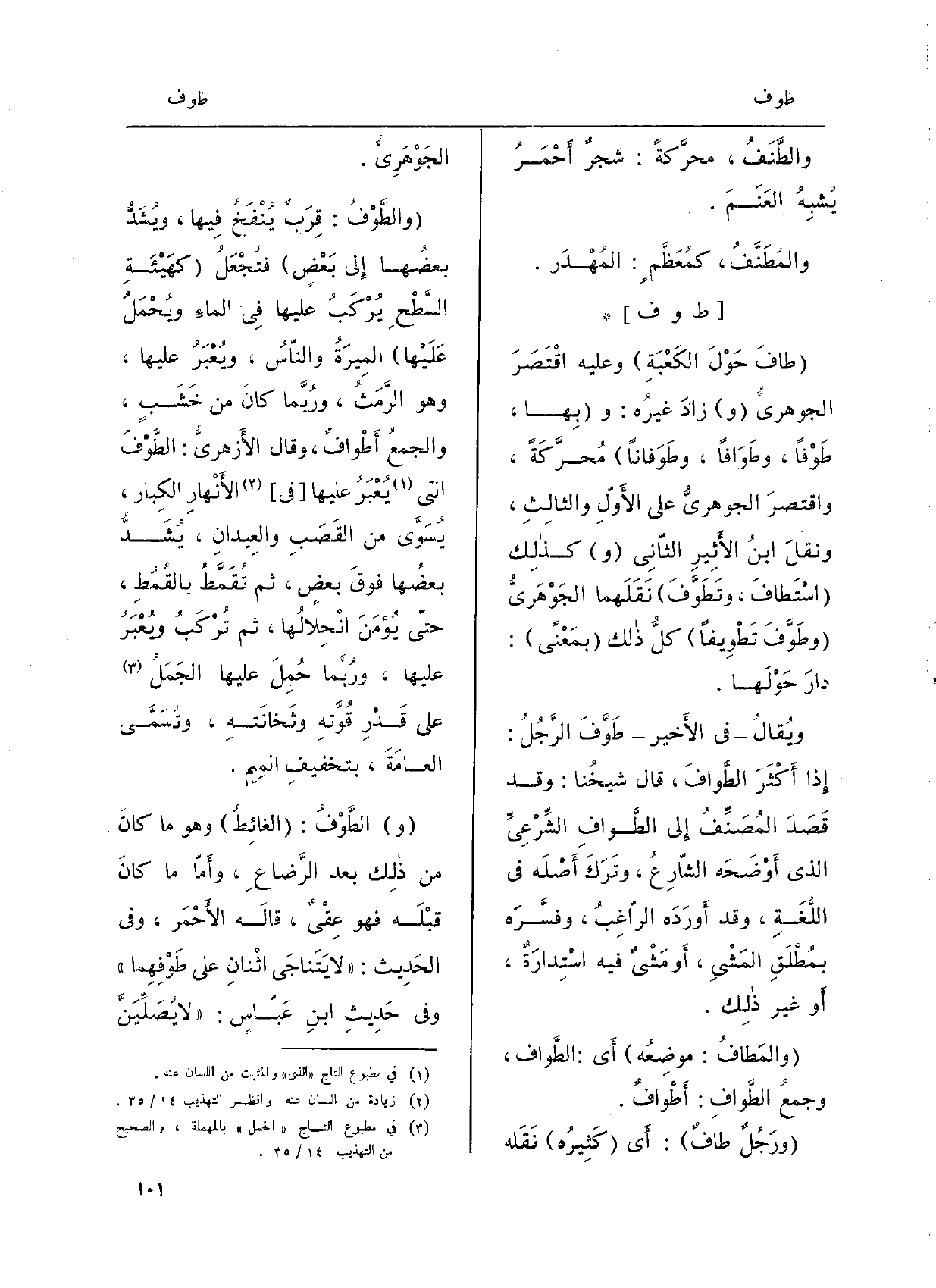 {طافَ حَوْلَ الكَعْبَةِ وَعَلِيهِ اقْتَصَرَ الجوهريُّ وزادَ غيرُه: وبِها،} طَوْفاً، {وطَوَافاً،} وطَوَفاناً مُحرَّكَةً، واقتصرَ الجوهريُّ على الأَوّلِ والثالثِ، ونقلَ ابنُ الأَثِيرِ الثانِي وكذلِك {اسْتَطافَ،} وتَطَوَّفَ نَقَلَهما الجَوهريُّ {وطَوَّفَ} تَطْوِيفاً، كلُّ ذَلِك بمَعْنًى: دارَ حَوْلَها. ويُقالُ فِي الأَخير {طَوَّفَ الرَّجُلُ: إِذا أَكْثَرَ} الطَّوافَ، قَالَ شيخُنا: وَقد قَصَدَ المُصَنِّفُ إِلى الطَّوافِ الشِّرْعِيِّ الَّذِي أَوْضَحَه الشّارِعُ، وتَرَكَ أَصْلَه فِي اللُّغَةِ، وَقد أَورَدَه الرّاغِبُ، وفسَّرَه بمُطْلَقِ المَشْيِ، أَو مَسْيٌ فِيهِ اسْتِدارَةٌ، أَو غير ذَلِك. {والمَطافُ: موضِعُه أَي: الطَّواف، وجمعُ الطَّوافِ:} أَطْوافٌ. ورَجُلٌ {طافٌ: أَي كَثِيرُه نَقَله الجَوْهَرِيُّ.} والطَّوْفُ: قِرَبٌ يُنْفَخُ فِيها، ويُشَدُّ بعضُها إِلَى بَعْضٍ فتُجْعَلُ كهَيْئَةِ السَّطْحِ يُرْكَبُ عَلَيْهَا فِي المَاء ويُحْمَلُ عَلَيْها المِيرَةُ والنّاسُ، ويُعْبَرُ عَلَيْهَا، وَهُوَ الرَّمَثُ، ورُبَّما كانَ من خَشَبٍ، والجمعُ أَطْوافٌ، وَقَالَ الأَزهريُّ: {الطَّوْفُ الَّتِي يُعْبَرُ عَلَيْهَا فِي الأنْهارِ الكِبار، يُسَوَّى من القَصَبِ والعِيدانِ، يُشَدُّ بعضُها فوقَ بعضٍ، ثمَّ تُقَمَّطُ بالقُمُطِ، حَتَّى يُؤمَنَ انْحِلالُها، ثمَّ تُرْكَبُ ويُعْبَرُ عَلَيْهَا، ورُبَّما حُمِلَ عَلَيْهَا الجَمَلُ على قَدْرِ قُوَّتِهِ وثَخانَتهِ، وتُسَمَّى العامَةَ، بتخفيفِ الْمِيم.
