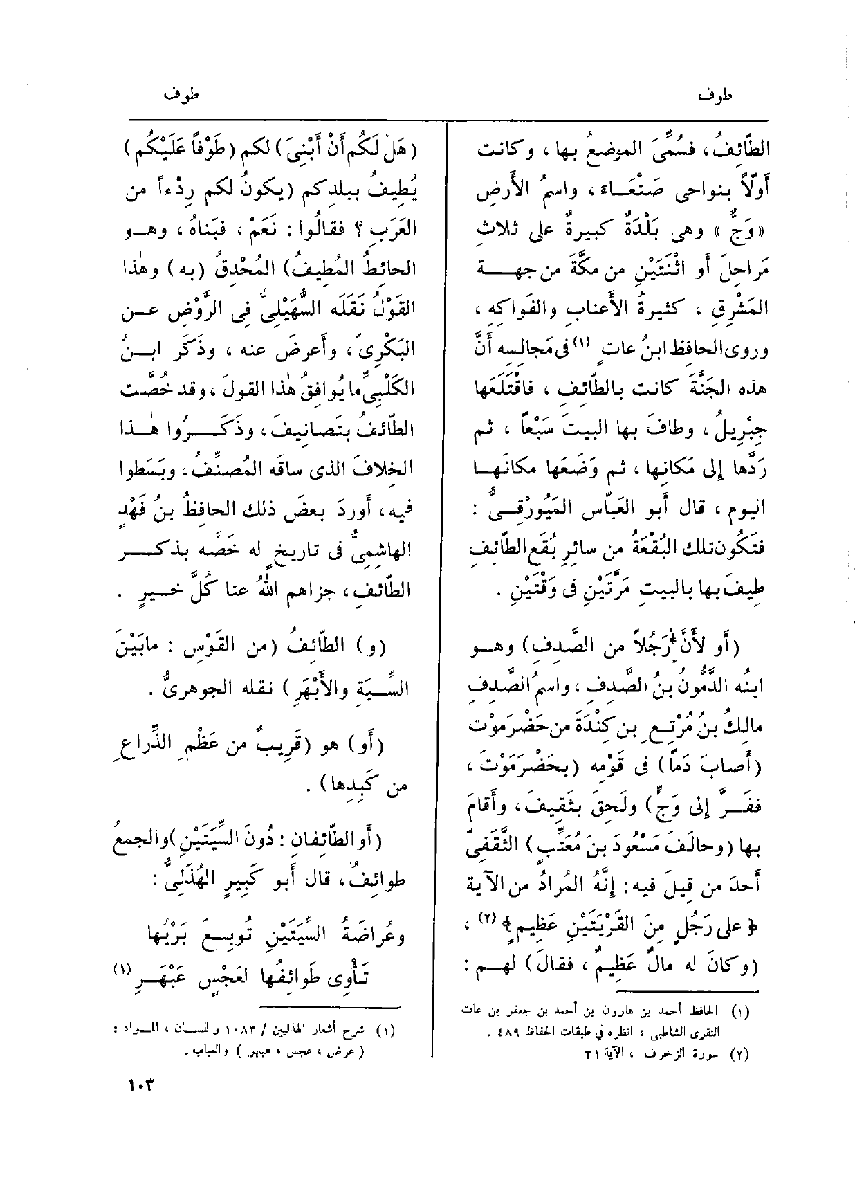 الرَّوْضِ عَن البَكْرِيّ، وأَعرضَ عَنهُ، وذَكَر ابنُ الكَلْبِيِّ مَا يُوافِقُ هَذَا القولَ، وَقد خُصَّت الطّائفُ بتَصانِيفَ، وذَكَرُوا هَذَا الخِلافَ الَّذِي ساقَه المُصنِّفُ، وبَسَطوا فِيهِ، أَوردَ بعضَ ذَلِك الحافِظُ بنُ فَهْدٍ الهاشِمِيُّ فِي تاريخٍ لَهُ خَصَّه بِذكر الطّائفِ، جزاهم اللهُ عَنَّا كُلَّ خيرٍ.