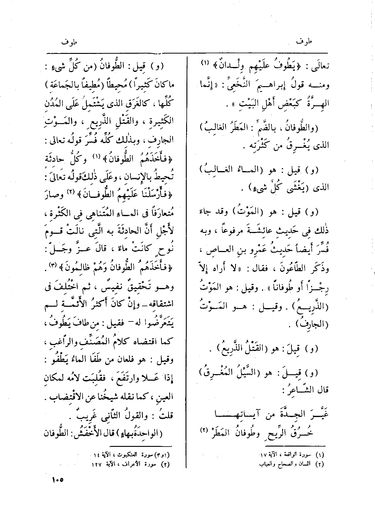 وقِيل: {الطُّوفانُ من كُلِّ شيءٍ: مَا كانَ كَثِيراً مُحِيطاً} مُطِيفاً بالجَماعَةِ كُلِّها، كالغَرَقِ الَّذِي يَشْتَمِلُ عَلى المُدُنِ الكَثِيرةِ، والقَتْلِ الذَّريعِ، والمَوْتِ الجارِفِ، وَبِذَلِك كُلِّه فُسِّرَ قولُه تَعَالَى: فأَخَذَهُمُ الطُّوفانُ وكُلُّ حادِثَةٍ تُحِيطُ بالإِنسانِ، وعَلى ذلِكَ قولُه تَعالى: فأَرْسَلْنَا عَلَيْهِمُ الطُّوفانَ وصارَ مُتعارَفاً فِي الماءِ المُتَناهِي فِي الكَثْرةِ، لأَجْلِ أَنَّ الحادِثَةَ بِهِ التِي نالَتْ قومَ نوحٍ كانَتْ مَاء، قالَ عزَّ وجلّ: فأَخَذَهُمُ الطُّوفانُ وَهُمْ ظالِمُونَ. وَهُوَ تَحْقِيقٌ نفِيسٌ، ثمَّ اخْتُلِفَ فِي اشتقاقِه وإِنْ كانَ أَكثرُ الأَئمَّةِ لم يَتَعَرَّضُوا لَهُ فَقيل: من طافَ يَطُوفُ، كَمَا اقْتَضَاهُ كلامُ المُصَنِّفِ والرّاغبِ، وَقيل: هُوَ فلعان من طَفَأ الماءُ يَطْفو: إِذ عَلا وارتَفَعَ، فقُلِبَت لأمُه لمكانِ العينِ، كَمَا نَقله شيخُنا عَن الاقْتِضاب. قلتُ: والقولُ الثانِي غَرِيبٌ. الواحدةُ بهاء قَالَ الأَخْفَشُ: الطُّوفان