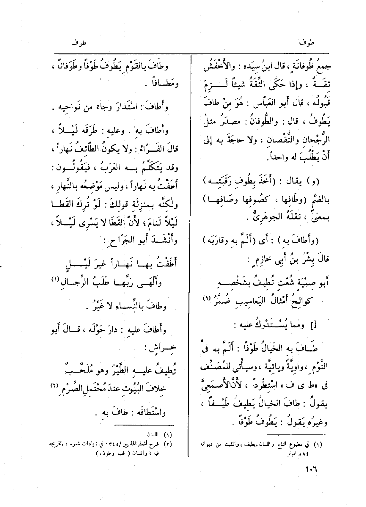 وَمِمَّا يُسْتَدرك عَلَيْهِ: طَافَ بهِ الخَيالُ طَوْفاً: أَلَمَّ بِهِ فِي النَّوْمِ، واوِيَّة ويائِيَّة، وسيأْتي للمُصَنَّف فِي ط ي ف اسْتِطْرداً، لأَنَّ الأَصمَعِيَّ يقولُ: طافَ الخيالُ يَطِيفُ طَيْفاً، وغيرُه يَقولُ: يَطُوفُ طَوْفاً. وطَافَ بالقَوم يَطُوفُ طَوْفاً وَطَوَفاناً،} ومَطافاً. وأَطافَ اسْتَدارَ وجاءَ من نَواحِيه. وأَطافَ بهِ، وعليهِ: طَرَقَه لَيْلاً، قالَ الفرّاءُ: وَلَا يكونُ الطّائِفُ نَهاراً، وَقد يَتَكَلَّمُ بِهِ العَرَبُ، فيَقُولُون: {أَطَفْتُ بِهِ نَهاراً، وَلَيْسَ مَوْضِعُه بالنَّهارِ، ولكِنَّه بمنزِلَةِ قولِكَ: لَوْ تُرِكَ القَطا لَيْلاً لَنَامَ لأَنّ القَطَا لَا يَسْرِي لَيْلاً، وأَنْشَدَ أَبو الجَرّاحِ: