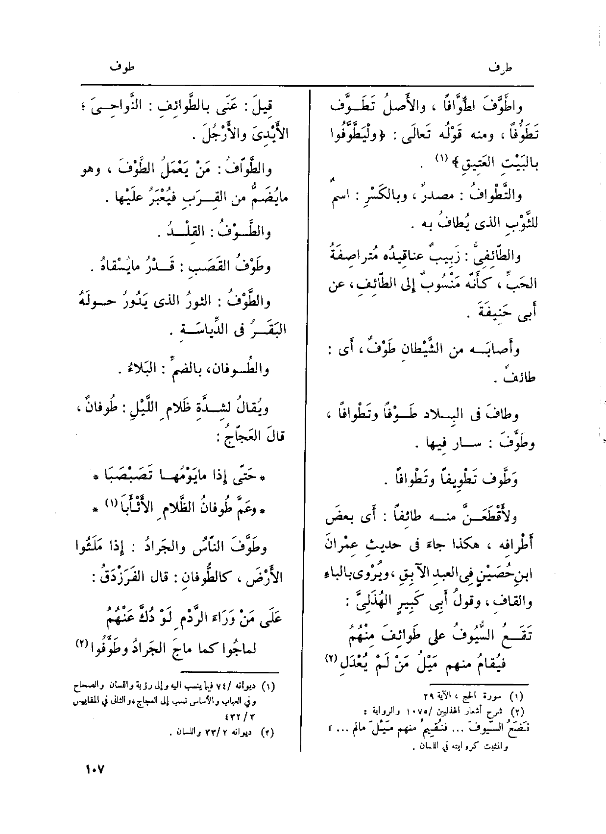 قِيلَ: عَنَى} بالطَّوائِفِ: النَّواحِيَ الأَيْدِيَ والأَرْجُلَ. {والطَّوّافُ: مَنْ يَعْمَلُ} الطَّوْفَ، وَهُوَ مَا يُضَمُّ من القِرَبِ فيُعْبَرُ علَيْها. {والطَّوْفُ: القِلْدُ.} وطَوْفُ القَصَبِ: قَدْرُ مَا يُسْقاهُ. والطَّوْفُ: الثورُ الَّذِي يدُورُ حولَهُ البَقَرُ فِي الدِّياسَةِ. {والطُوفان، بالضمِّ: البَلاءُ.