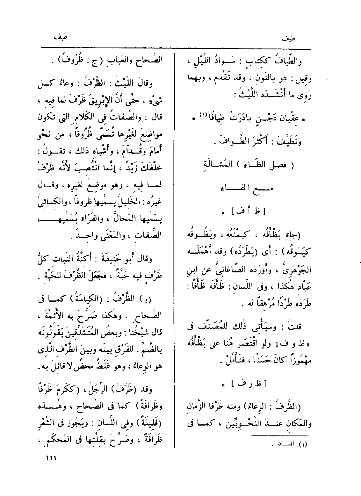 الظَّرفُ: الوِعاءُ وَمِنْه ظَرْفا الزَّمانِ والمَكانِ عندَ النَّحْوِيين، كَمَا فِي الصِّحَاح والعُبابِ ج: ظُرُوفٌ. وقالَ اللَيْثَ: الظَّرْفُ: وعاءُ كل شَيءٍ، حَتَّى أَنَّ الإِبْرِيقَ ظَرْفَ لما فِيه، قَالَ: والصِّفاتُ فِي الكلامِ الَّتِي تكون مواضِعَ لغَيْرِها تُسَمّى ظُرُوفاً، من نحْو أَمامَ وقُدّامَ، وأَشْباه ذَلِك، تقولُ: خلْفَكَ زَيْدٌ، إِنَّما انْتُصِبَ لأَنَّه ظرْفْ لما فِيهِ، وَهُوَ موضِع لغيرِه، وَقَالَ غيرُه: الخَلِيلُ يسميها ظروفاً، وَالْكسَائِيّ يسميها المَحالَّ، والفَراءَ يُسميها الصِّفاتِ، والمَعْنَى واحِدٌ.