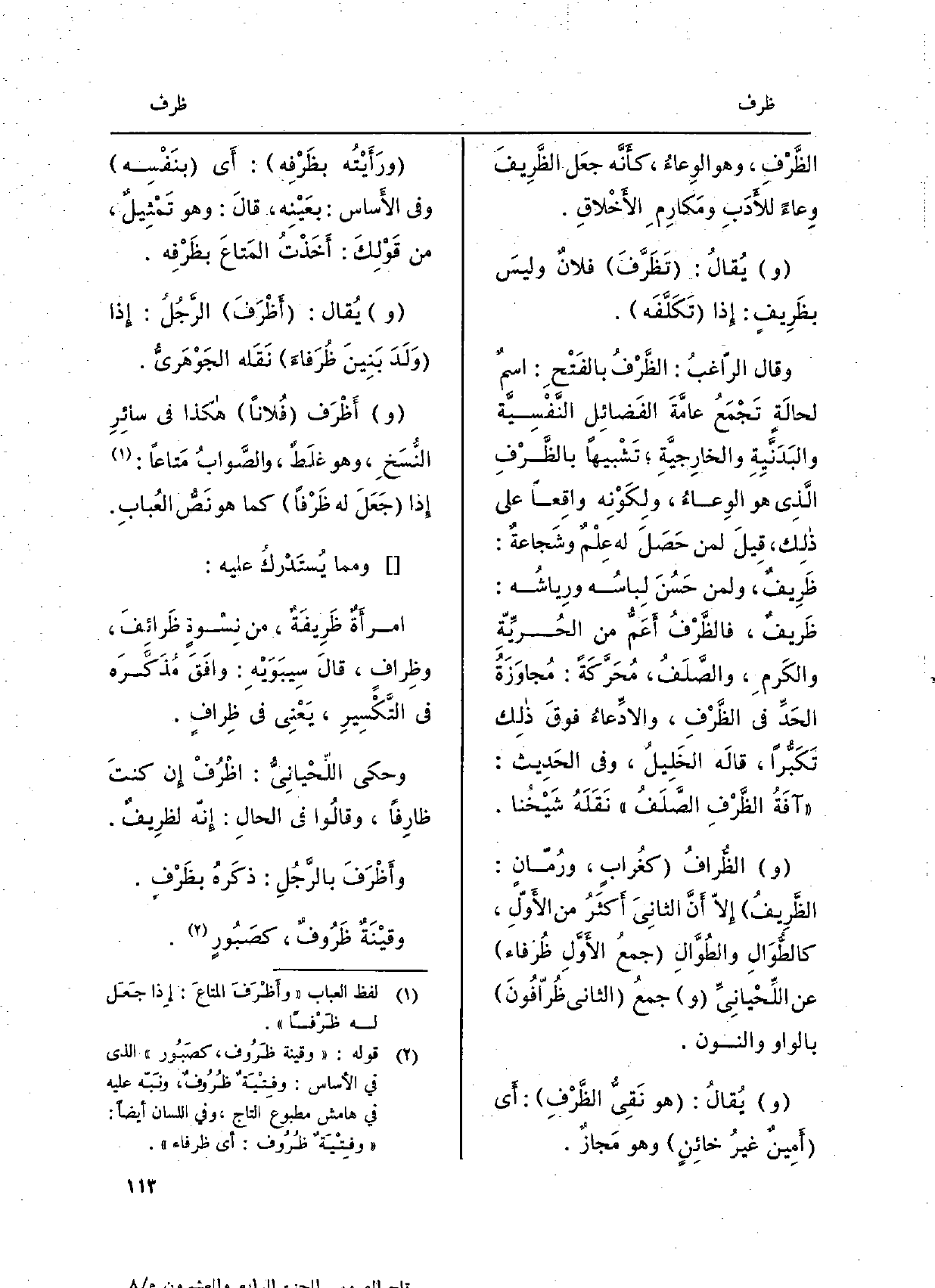 الظَّرْفِ، وَهُوَ الوِعاءُ، كأَنَّه جعَل الظَّرِيفَ وِعاءً للأَدَبِ ومَكارمِ الأَخْلاقِ. ويقالُ: تَظَرَّفَ فلانٌ وليسَ بظَرِيفٍ: إِذا تَكَلَّفَه. وَقَالَ الراغبُ: الظَّرْفُ بالفَتْحِ: اسمٌ لحالَةٍ تَجْمَعُ عامَّةَ الفَضائِل النَّفْسِيَّة والبَدَنَّيِةِ والخارِجيَّةِ، تَشْبيهاً بالظَّرْفِ الَّذي هُوَ الوِعاءُ، ولِكَوْنِه واقِعاً على ذلِك، قِيلَ لمن حَصَلَ لَهُ عِلْمٌ وشَجاعةٌ: ظَرِيفٌ، وَلمن حَسُنَ لِباسُه ورِياشُه: ظَريفٌ، وَلمن حَسُنَ لِباسُه ورِياشُه: ظَريفٌ، وَلمن حَسُنَ لِباسُه ورِياشُه: ظَريفٌ، فالظَّرْفُ أَعَمُّ من الحُرِّيّة والكَرمِ، والصَّلَفُ، مُحَرَّكَةً: مُجاوَزَةُ الحَدِّ فِي الظَّرْفِ، والادِّعاءُ فوقَ ذلِك تَكَبُّراً، قَالَه الخَلِيلُ، وَفِي الحَدِيث: آفَةُ الظَّرْفِ الصَّلَفُ نَقَلَهُ شَيْخُنا. والظُّرافُ كغُرابٍ، ورُمّانٍ: الظَّرِيفُ إِلا أنَّ الثَّانِي أَكثَرُ من الأَوّلِ، كالطُّوَالِ والطُوَّالِ جمعُ الأَوَّلِ ظُرْفاء عَن اللِّحْيانِيِّ وجمعُ الثَّانِي ظُرَّافُونَ بِالْوَاو وَالنُّون. ويُقالُ: هُوَ نَقِيُّ الظَّرْفِ: أَي أَمِينٌ غيرُ خائِنٍ وَهُوَ مَجازٌ. ورَأَيْتُه بظَرْفِه: أَي بنَفْسِه وَفِي الأَساس: بعَيْنِه، قالَ: وَهُوَ تَمْثِيلٌ، من قَوْلِكَ: أَخَذْتُ المَتاعَ بظَرْفِه. ويُقال: أَظْرَفَ الرِّجُلُ: إِذا وَلَدَ بَنِينَ ظُرَفاءَ نَقَله الجَوْهَريُّ. وأَظْرَف فُلاناً هَكَذَا فِي سائِرِ النُسَخِ، وَهُوَ غلَطٌ، والصَّوابُ مَتاعاً: إِذا جَعَلَ لَهُ ظَرْفاً كَمَا هُوَ نَصٌّ العُبابِ.