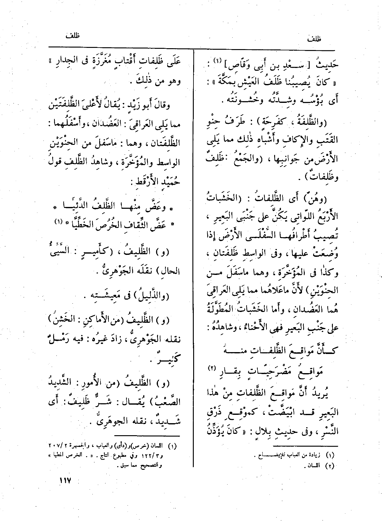 يُريدُ أَنَّ مَواقِعَ الظَّلِفاتِ مِنْ هَذَا البَعِيرِ قد ابْيَضَّتْ، كموْقِعِ ذَرْقِ النَّسْرِ، وَفِي حدِيثِ بِلالٍ: كانَ يُؤَذِّنُ علَى ظَلِفاتِ أَقْتابٍ مُغَرَّزَةٍ فِي الجِدارِ وَهُوَ من ذلِكَ. وَقَالَ أَبو زَيْدٍ: يُقالُ لأَعْلَى الظَّلفَتَيْن مِمَّا يَلِي العَراقِيَ: العَضُدان، وأَسْفَلُهما: الظَّلِفَتان، وهما: مَا سَفلَ من الحِنْوَيْنِ الواسِط والمُؤَخَّرَةِ، وشاهِدُ الظَّلِفِ قولُ حُمَيْدِ الأَرْقَطِ: وعَضَّ مِنْها الظَّلِفُ الدَّئِيَّا عَضَّ الثِّقافِ الخُرُصَ الخَطِّيَّا والظَّلِيفُ، كأَمِيرٍ: السِّيِّئُ الحالِ نقَلَه الجَوهريُّ.