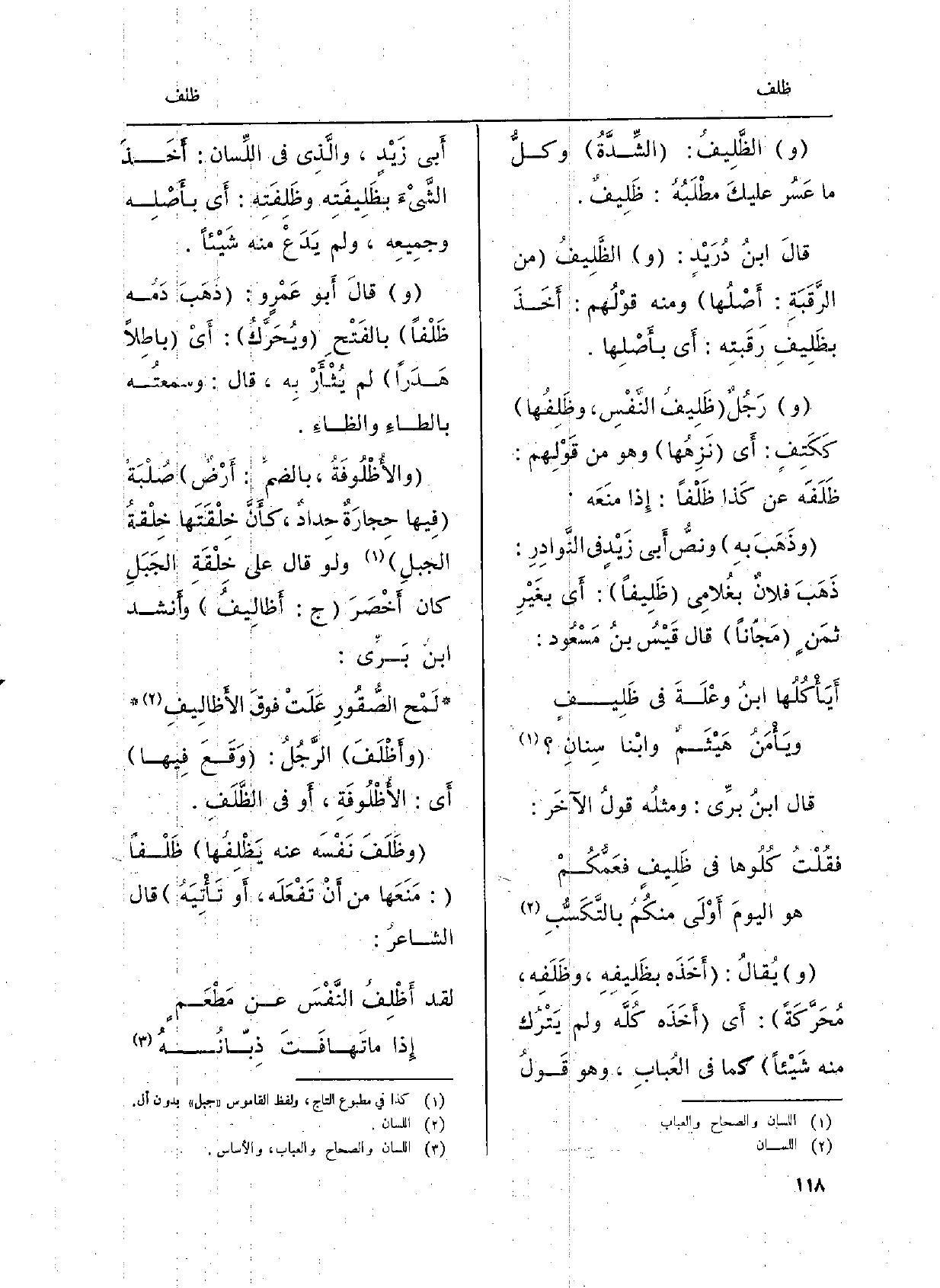 قالَ ابنُ دُرَيْدٍ: والظَّلِيفُ من الرّقَبَةِ: أَصْلُها وَمِنْه قوْلُهم: أَخَذَ بظَلِيفِ رَقَبتِه: أَي بأَصْلِها. ورَجُلٌ ظَلِيفُ النَّفْسِ، وظَلِفُها كَكَتِفٍ: أَي نَزِهُها وَهُوَ من قَوْلِهم: ظَلَفَه عَن كَذا ظَلْفاً: إِذا منَعَه. وذَهَبَ بهِ ونصُّ أَبي زَيْدٍ فِي النَّوادِرِ: ذَهَبَ فلانٌ بغُلامِي ظَلِيفاً: أَي بغَيْرِ ثمَنٍ مَجاناً قَالَ قَيْسُ بنُ مَسْعُود: