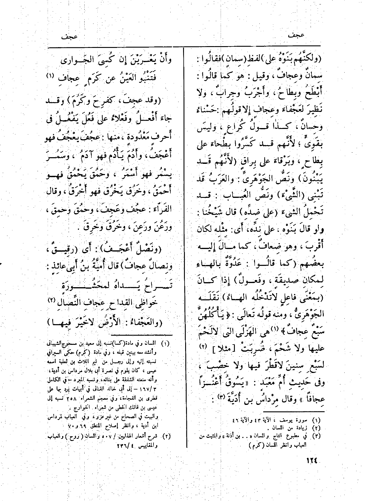 ولكنَّهُم بَنَوْهُ على لفظِ سِمانٍ فَقَالُوا: سِمانٌ وعِجافٌ، وَقيل: هُوَ كَمَا قَالُوا: أَبْطَحُ وبِطاحُ، وأَجْرَبُ وجِرابٌ، وَلَا نَظِيرَ لعَجْفاءَ وعِجافٍ إِلا قولُهم: حَسْناءُ وحِسانٌ، كَذَا قولُ كُراعٍ، وليسَ بقَوِيٍّ، لأنَّهم قد كسَّرُوا بطْحاءَ على بِطاحٍ، وبَرْقاءَ على بِراقٍ لأَنَّهُم قَد يَبْنُونَ ونَصُّ الجَوْهَرِيِّ: والعَرَبُ قَد تَبْنِي الشَّيْءَ ونَصُّ العُباب: قد تَحْمِلُ الشيءَ على ضِدِّهِ قَالَ شَيْخُنا: وَلَو قالَ بَنَوْه، على نِدِّه، أَي: مِثْلِه لَكَانَ أَقْربَ، وَهُوَ ضِعافٌ، كَمَا مالَ إِليه بَعضهم كَمَا قالُوا: عَدُوَّةٌ بالهاءِ لمكانِ صدِيقَةٍ، وفَعولٌ إِذا كانَ بمَعْنَى فاعِلٍ لَا تَدْخُلُه الهاءُ نَقَلَه الجَوْهَرِيُّ وَمِنْه قولُه تَعالَى: يَأْكُلُهُنَّ سَبْعٌ عِجافٌ هِيَ الهَزْلَى الَّتِي لَا لَحْمَ عَلَيْهَا وَلَا شَحْمَ، ضُرِبَتْ مثلا لسَبْعِ سِنينَ لَا قَطْرَ فِيهَا وَلَا خِصْبَ، وَفِي حَدِيثِ أُمّ مَعْبَدٍ: يَسُوقُ أَعْنُزاً عِجافاً وَقَالَ مِرْداسُ بن أُدَيَّةَ: