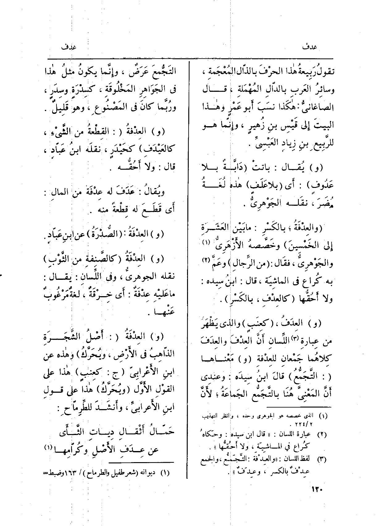 نقولُ رَبِيعُةُ هَذَا الحرْفَ بالذّال المُعْجَمةِ، وسائِرُ العَربِ بالدّالِ المُهْمَلةِ، قَالَ الصاغانيُّ: هَكَذَا نسَبَ أَبو عَمْرٍ وَهَذَا البيتَ إِلى قَيْسِ بن زُهيرٍ، وإِنما هُوَ للرَّبِيعِ بن زِيادٍ العَبْسِيِّ. ويُقال: باتتْ دابَّةٌ بِلَا عَدُوفٍ: أَي بِلَا عَلَفٍ هَذِه لُغَةُ مُضَرَ، نقَله الجَوْهرِيُّ. والعِدْفَةُ، بالكَسْرِ: مَا بَيْن العَشَرةِ إِلَى الخَمْسِينَ وخَصَّصهُ الأَزْهَرِيُّ والجَوْهرِيُّ، فَقَالَ: من الرِّجالِ وعَمَّ بِهِ كُراع فِي الماشِيَة، قَالَ: ابنُ سِيده: وَلَا أَحُقُّها كالعِدْفِ، بالكَسْرِ. والعِدَفُ، كعِنَبٍ وَالَّذِي يَظْهَرُ من عِبارةِ اللِّسانِ أَنَّ العِدْفةِ ومَعْناها: التَّجَمُّعُ قالَ ابنُ سِيدَه: وعندِي أَنَّ المَعْنِيَّ هُنَا بالتَّجَمُّع الجَماعَةُ، لأَنَّ التَجُّمعَُ عَرَضٌ، وإِنَّما يكونُ مثلُ هَذَا فِي الجَوَاهِرِ المَخْلُوقَةِ، كسِدْرَةٍ وسِدَرٍ، ورُبَّما كانَ فِي المَصْنُوعِ، وَهُوَ قَلِيلٌ. والعِدْفَةُ: القِطْعةُ من الشَّيْءِ، كالعَيْدَفِ كحَيْدرٍ، نقلَه ابنُ عَبّادٍ، قَالَ: وَلَا أَحُقُّه. ويُقالُ: عَدَفَ بِهِ عِدْفَة من المالِ: أَي قَطَعَ لَهُ قِطْعَةً مِنْهُ.