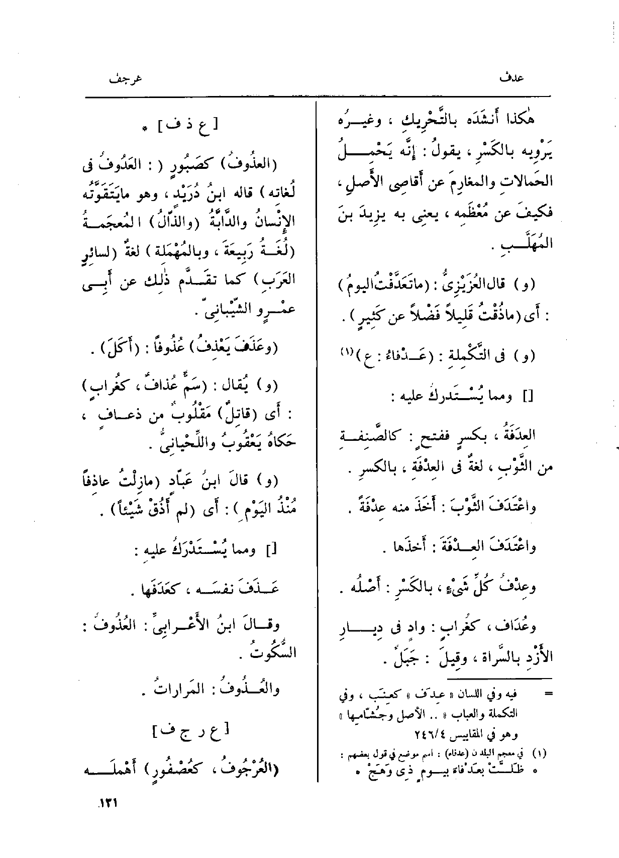 وَمِمَّا يسْتَدرك عَلَيْهِ: عَذَفَ نَفسه، كعَدَفَها. وَقَالَ ابْن الْأَعرَابِي: العُذُوفُ: السكوتُ. والعُذُوفُ: المَراراتُ.