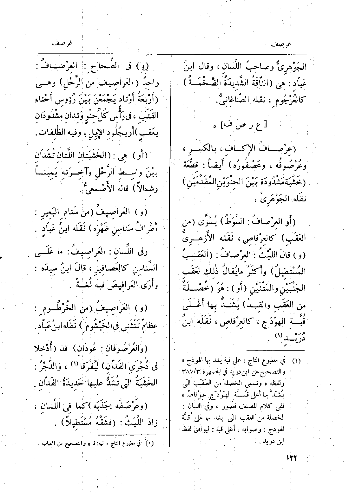 عِرْصافُ الإِكافِ، بِالْكَسْرِ، وعُرْصُوفُه، وعُصْفُورُه أَيضاً: قِطْعَة خَشَبة مَشْدُودَة بَيْنَ الحِنْوَيْنِ المُقَدَّمَيْنِ نقَله الجَوْهَرِيُّ. أَو العِرْصافُ: السَّوْطُ يُسَوَّى من العَقَبِ كالعِرْفاصِ، نَقله الْأَزْهَرِي وَقَالَ الليثُ،: العِرْصافُ: العَقبُ المُسْتطِيلُ، وأَكثَرُ مَا يُقالُ ذلِك لعَقَبِ الجَنْبَيْنِ والمَتْنَيْنِ أَو: هُوَ خُصْلَةٌ من العَقَبِ والقِدِّ يُشَدُّ بِها أَعْلَى قُبَّةِ الهوْدَج، كالعِرْفاصِ، نَقله ابْن دُرَيْدٍ. وَفِي الصحاحِ: العِرْصافُ: واحِدُ العَراصِيف من الرَّحْلِ وَهِي أَرْبعَةُ أَوْتاد يَجْمَعْنَ بَيْنَ رُؤوسِ أَحْناءِ القَتَبِ، فِي رأَسِ كل حِنْوٍ وتِدانِ مشْدُودَانِ بعَقبٍ أَو بجُلُودِ الإِبلِ، وَفِيه الظَّلِفاتِ. أَو هِيَ: الخَشَبتانِ اللَّتانِ تُشَدّانِ بيْنَ واسِطِ الرَّحْلِ وأخِرَتهِ يَمِيناً وِشمالاً قَالَ الأَصمعي. والعَراصِيفُ من سَنامِ البَعِيرِ: أَطْرافُ سَناسِنِ ظَهْرِه نَقَله ابنُ عَبادٍ. وَفِي اللسانِ: العَراصِيفُ: مَا عَلى السَّناسِنِ كالعَصافيرِ، قَالَ ابْن سِيدَه: وأَرَى العَرافِيَصَ فِيهِ لُغةً. والعَراصِيفُ من الخُرْطُومِ: عِظامٌ تَنْثَنِي فِي الخَيْشُومِ نَقَله ابنُ عَبّادِ. والعُرْصُوفانِ: عُودانِ قد أُدْخلا فِي دُجْرَي الفَدانِ ليُفْرَقا، والدُّجْرُ: الخَشَبَةُ الَّتِي تُشَدُّ عَلَيْهَا حَدِيدَةُ الفَدَّانِ وعَرْصَفَة: جَذَبَه كَمَا فِي اللِّسانِ، زادَ اللَّيْثُ: فشَقَّهُ مُسْتَطِيلاً.
