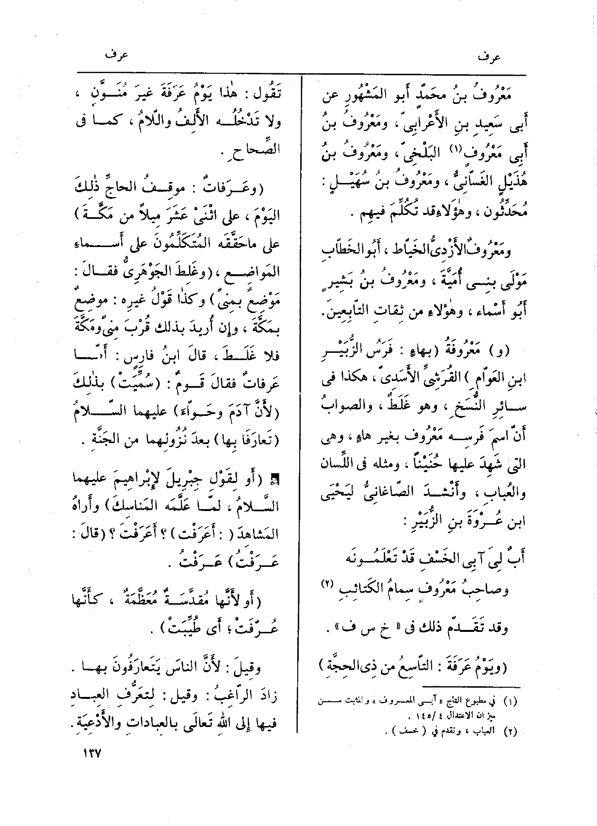 وَقد تَقَدّم ذَلِك فِي خَ س ف. ويَوْمُ عَرَفَةَ: التاسِعُ من ذِي الحجةِ. تَقول: هَذَا يَوْمُ عَرَفَةَ غيرَ مُنَوَّنٍ، وَلَا تَدْخُلُه الأَلِفُ واللامُ، كَمَا فِي الصِّحَاح.