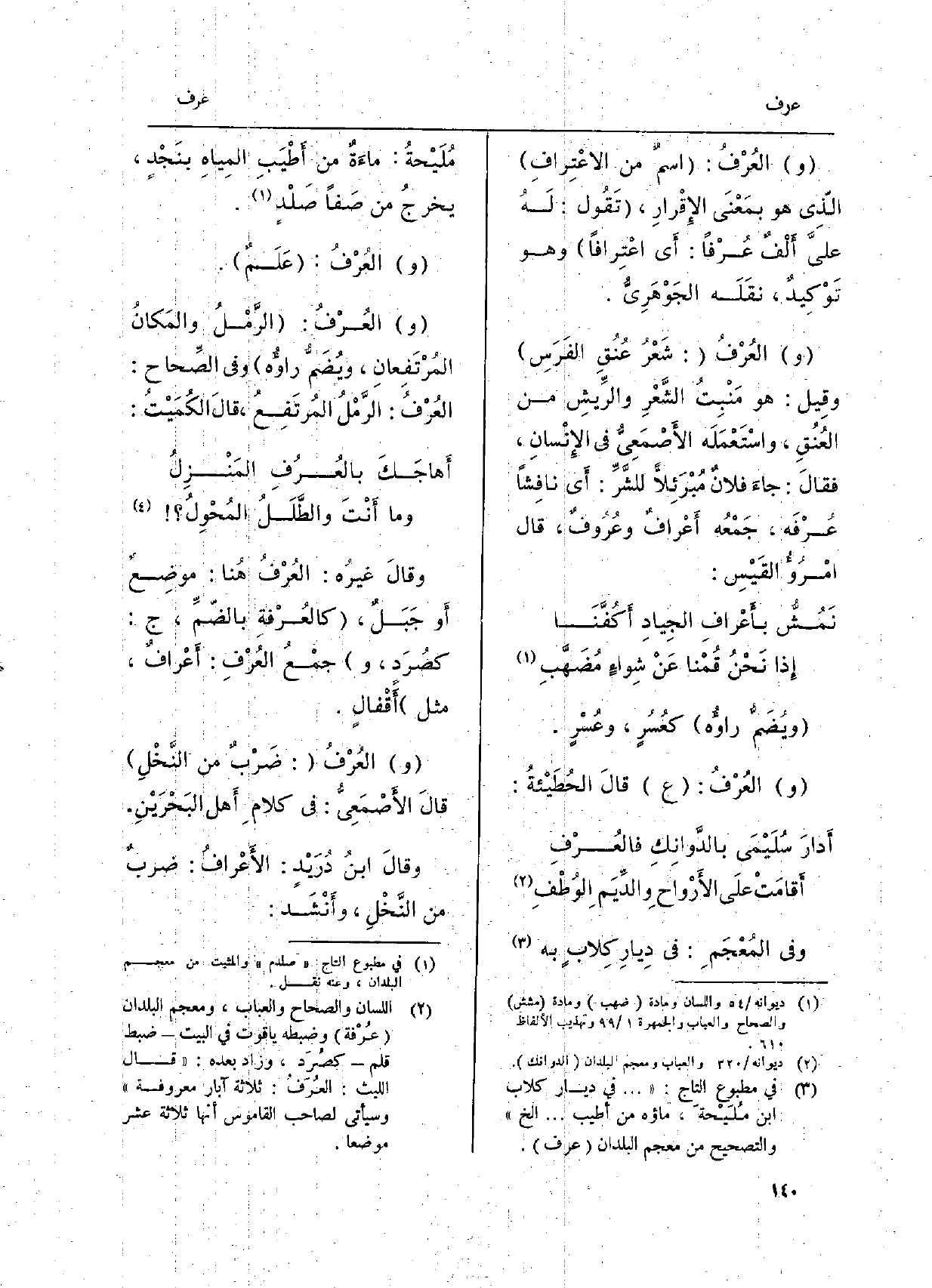 والعُرْفُ: علَمٌ. والعُرْفُ: الرَّمْلُ والمَكانُ المُرتَفِعانِ، ويُضَمُّ راؤُه وَفِي الصِّحاحِ: العُرْفُ الرَّمْلُ المرتفعُ، قَالَ الكُمَيْتُ: