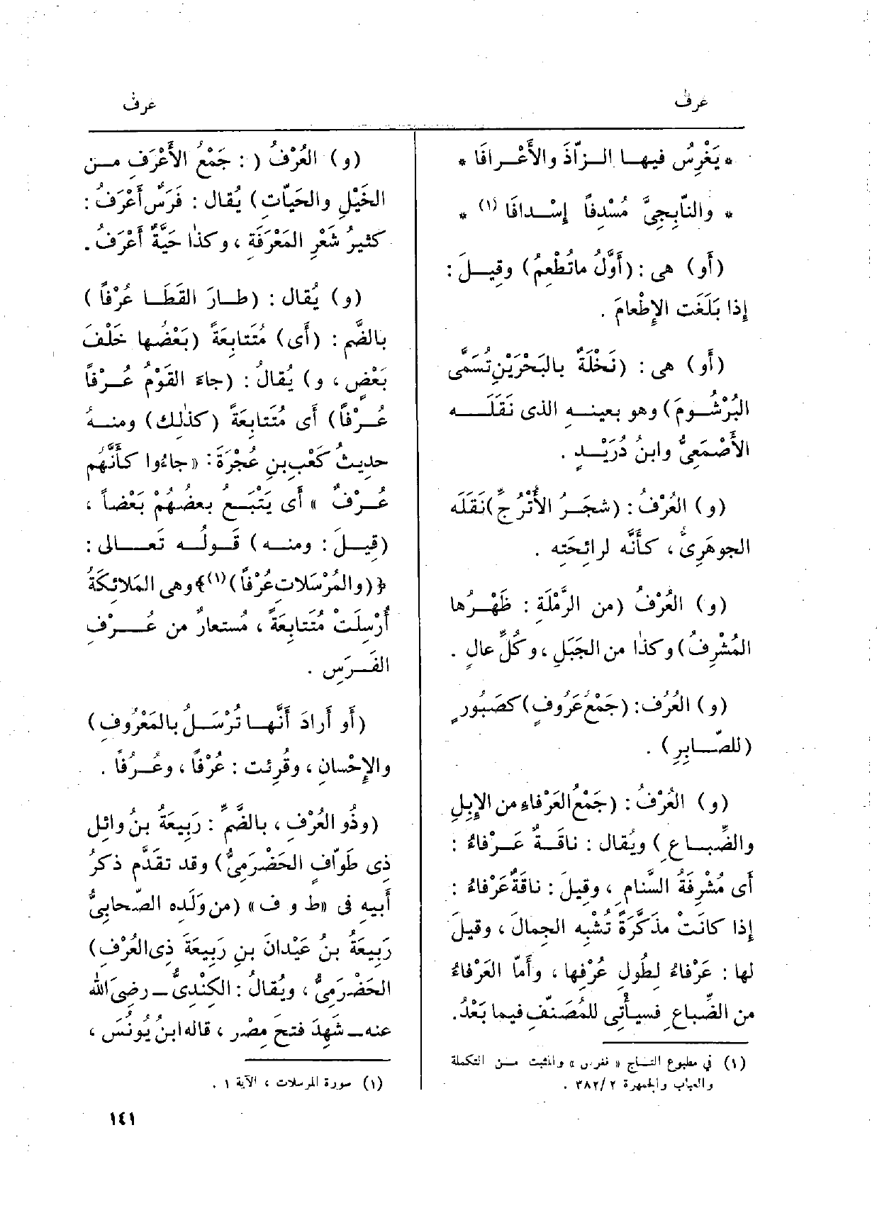 كصَبُورٍ للصابِرِ. والعُرْفُ: جَمْعُ العَرْفاءِ من الإِبلِ والضِّباعِ ويُقال: ناقَةٌ عَرْفاءُ: أَي مُشْرِفَةُ السَّنامِ، وقِيلَ: ناقَةٌ عَرْفاءُ: إِذا كانَتْ مذَكَّرَةً تُشْبِه الجِمالَ، وقيلَ لَهَا: عَرْفاءُ لِطُولِ عُرْفِها، وأَمّا العَرْفاءُ من الضِّباعِ فسيأْتِي للمُصَنّفِ فِيمَا بَعْدُ. والعُرْفُ: جَمْعُ الأَعْرَفِ من الخَيْلِ والحَيّاتِ يُقال: فَرَسٌ أَعْرَفُ: كثيرُ شَعْرِ المَعْرَفَةِ، وَكَذَا حَيَّةٌ أَعْرَفُ. ويُقال: طارَ القَطَا عُرْفاً بالضَّم: أَي مُتَتابِعَةً بَعْضُها خَلْفَ بَعْضِ، ويُقالُ: جاءَ القَوْمُ عُرْفاً عُرْفاً أَي مُتَتابِعَةً كَذَلِك ومنهُ حدِيثُ كعْبِ بنِ عُجْرَةَ: جاءُوا كأَنَّهُم عُرْفٌ أَي يَتْبَعُ بعضُهُمْ بَعْضاً، قِيلَ: وَمِنْه قَولُه تَعَالَى: والمُرْسَلاتِ عُرْفاً وَهِي الملائكةُ أُرْسِلَتْ مُتَتابِعَةً، مُستعارٌ من عُرْفِ الفَرَسِ. أَو أَرادَ أَنَّها تُرْسَلُ بالمَعْرُوفِ والإِحْسانِ، وقُرِئت: عُرْفاً، وعُرُفاً. وذُو العُرْفِ، بالضَّمِّ: رَبِيعَةُ بنُ وائِل ذِي طَوّافٍ الحَضْرَمِيُّ وَقد تقَدَّم ذكرُ أَبيهِ فِي ط وف من وَلَدِه الصّحابِيُّ رَبِيعَةُ بنُ عَيْدانَ بنِ رَبِيعَةَ ذِي العُرْفِ الحَضْرَمِيُّ. وَيُقَال: الكِنْدِيُّ رَضِي الله عَنهُ شَهدَ فتح مِصْر، قَالَه ابنُ يُونُسَ،