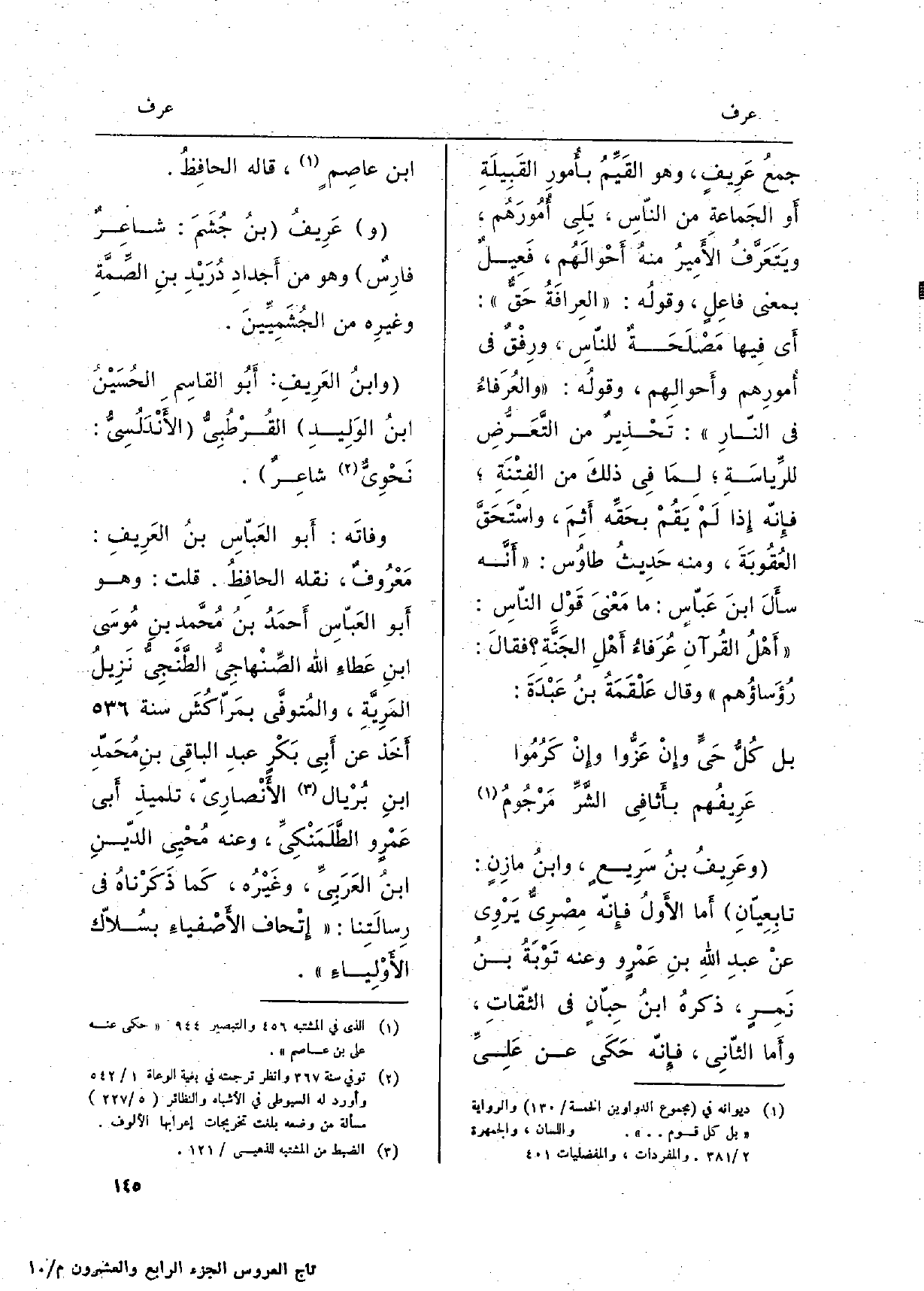 جمعُ عَرِيفٍ، وَهُوَ القَيِّمُ بأُمورِ القَبِيلَةِ أَو الجَماعةِ من النّاسِ، يَلِي أُمُورَهُم، ويَتَعَرَّفُ الأَمِيرُ منهُ أَحْوالَهُم، فَعِيلٌ بِمَعْنى فاعِلٍ، وقولُه: العِرافَةٌ حَقٌّ: أَي فِيها مَصْلَحَةٌ للنّاسِ، ورِفْقٌ فِي أُمورِهم وأَحوالِهم، وقولُه: والعُرَفاءُ فِي النّارِ: تَحْذِيرٌ من التَّعَرُّضِ للرِّياسَةِ لِما فِي ذَلِك من الفِتْنَةِ فإِنَّه إِذا لَمْ يَقُمْ بحَقِّه أَثِمَ، واسْتَحَقَّ العُقُوبَةَ، وَمِنْه حَدِيثُ طاوُس: أَنَّه سأَلَ ابنَ عَبّاسٍ: مَا مَعْنَى قَوْلِ النّاسِ: أَهْلُ القُرآنِ عُرَفاءُ أَهْلِ الجَنَّةِ فقالَ: رُؤَساؤُهم وَقَالَ عَلْقَمَةُ بنُ عَبْدَةَ: