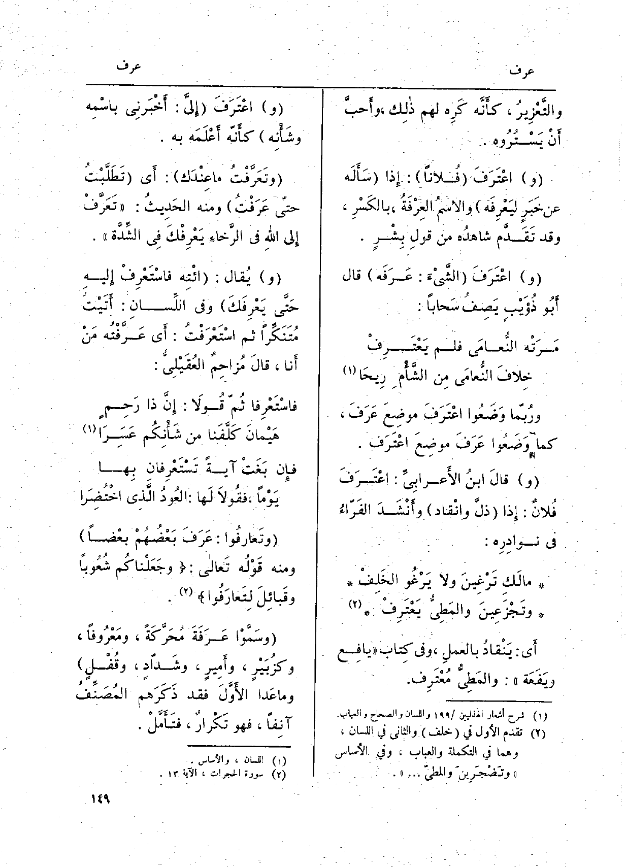 ورُبّما وَضَعُوا اعْتَرَفَ موضِعَ عَرَفَ، كَمَا وَضَعوا عَرَف موضِعَ اعْتَرَف. وقالَ ابنُ الْأَعرَابِي: اعْتَرَفَ فُلانٌ: إِذ ذلَّ وانْقاد وأَنْشَدَ الفَرّاءُ فِي نوادِرِه: مالَكِ تَرْغِينَ وَلَا يَرْغُو الخَلِفْ وتَجْزَعِينَ والمَطِيُّ يَعْتَرِفْ أَي: يَنْقادُ بالعملِ، وَفِي كِتاب يافِع ويَفَعَة: والمَطِيُّ مُعْتَرِف.