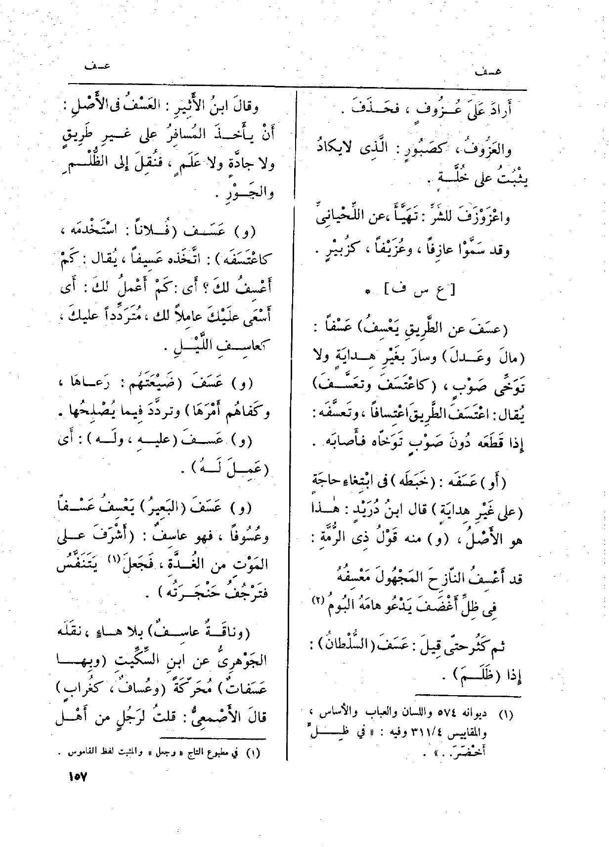 ثمَّ كَثُر حتّى قِيلَ: عَسَف السُّلْطانُ: إِذا ظَلَم. وقالَ ابنُ الأَثِيرِ: العَسْفُ فِي الأَصْلِ: أَنْ يأَخذَ المُسافَرُ على غيرِ طَرِيقٍ وَلَا جادَّةٍ وَلَا عَلَمٍ، فنُقِلَ إِلَى الظُّلْمِ والجَوْرِ. وعَسَف فُلاناً: اسْتَخْدمَه، كاعْتَسَفَه: اتَّخَذه عَسِيفاً، يُقال: كَمْ أَعْسِفُ لكَ أَي: كَمْ أَعْملُ لكَ: أَي أَسْعَى علَيْكَ عامِلاً لَك، مُتَرَدِّداً عليكَ، كعاسِفِ اللَّيْلِ. وعَسَفَ ضَيْعَتَهُم: رَعاهَا، وكَفاهُم أَمْرَهَا وتردَّدَ فِيما يُصْلِحُها.