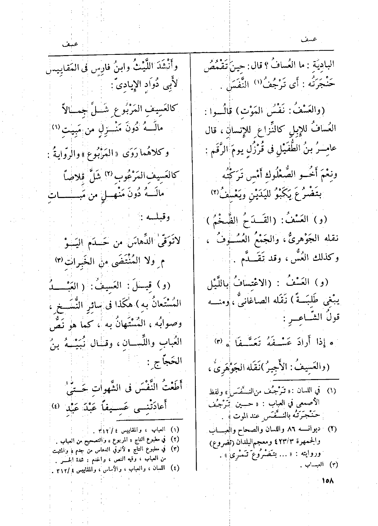الاعْتِسافُ باللَّيْل يبْغِي طَلِبَةً نَقله الصاغانيُّ، وَمِنْه قولُ الشّاعِرِ: إِذا أَرادَ عَسْفَهُ تَعَسَّفا والعَسِيفُ: الأَجِيرُ نَقَله الجَوْهَرِيُّ، وأَنْشَدَ اللَّيْثُ وابنُ فارِسٍ فِي المَقايِيِس لأَبِي دُوَادٍ الإِيادِيّ: كالعَسِيفِ المَرْبُوعِ شَلِّ جِمالاً مَا لَهُ دُونَ مَنْزِلٍ من مَبِيتِ وكِلاهُما رَوَى المَرْبُوع والرّوايةُ: