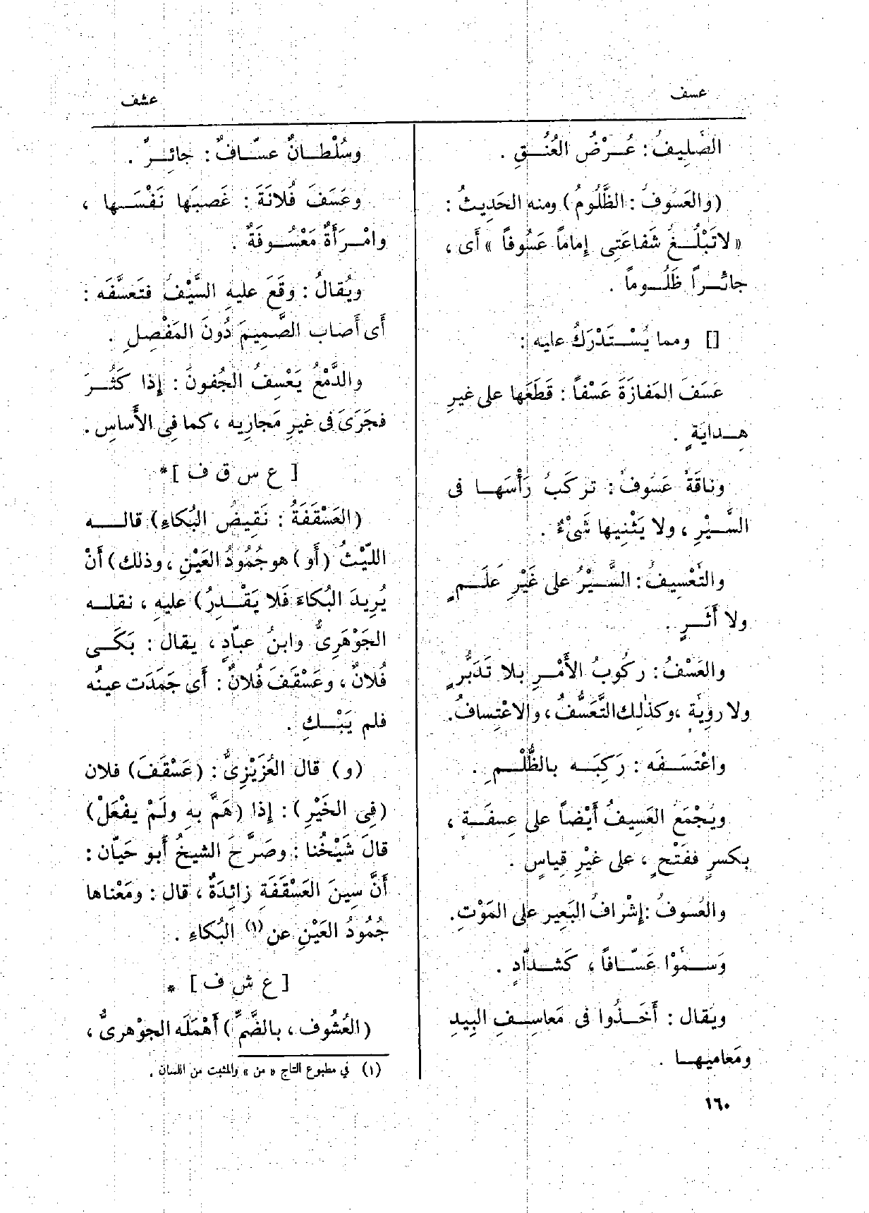 الصَّلِيفُ: عُرْضُ العُنُقِ. والعَسُوفُ: الظَّلُومُ وَمِنْه الحديثُ: لَا تَبْلُغُ شَفاعَتِي إِمَامًا عَسُوفاً أَي، جائراً ظلوماً.
