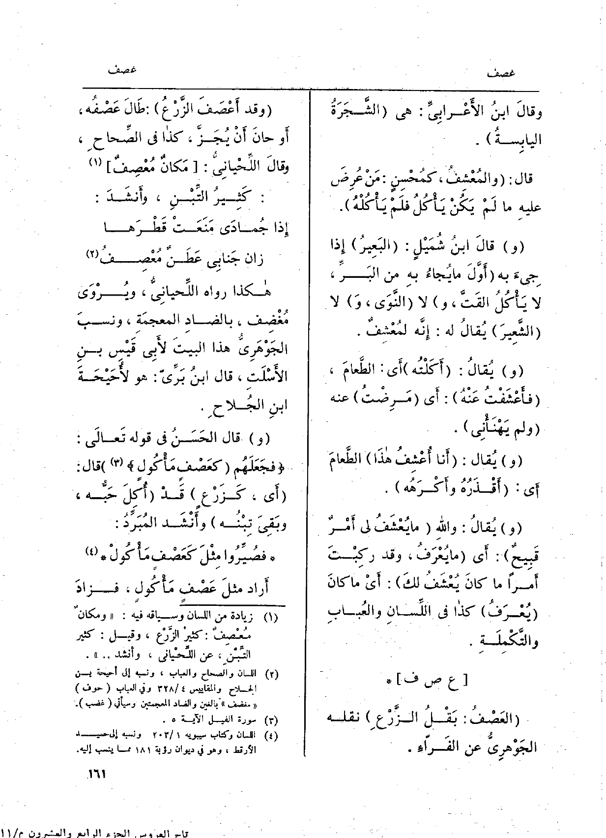 وَقَالَ الحَسَنُ فِي قَوْله تَعَالَى: فجَعَلَهُم كعَصْفٍ مَأْكُولٍ قَالَ: أَي، كَزَرْعٍ قد أُكِلَ حَبُّه، وبَقِيَ تِبْنُه وأَنْشَد المُبَرِّدُ: فصُيِّرُوا مِثْلَ كَعَصْفِ مَأْكُولْ أَراد مثلَ عَصْفٍ مَأْكُولٍ، فزادَ
