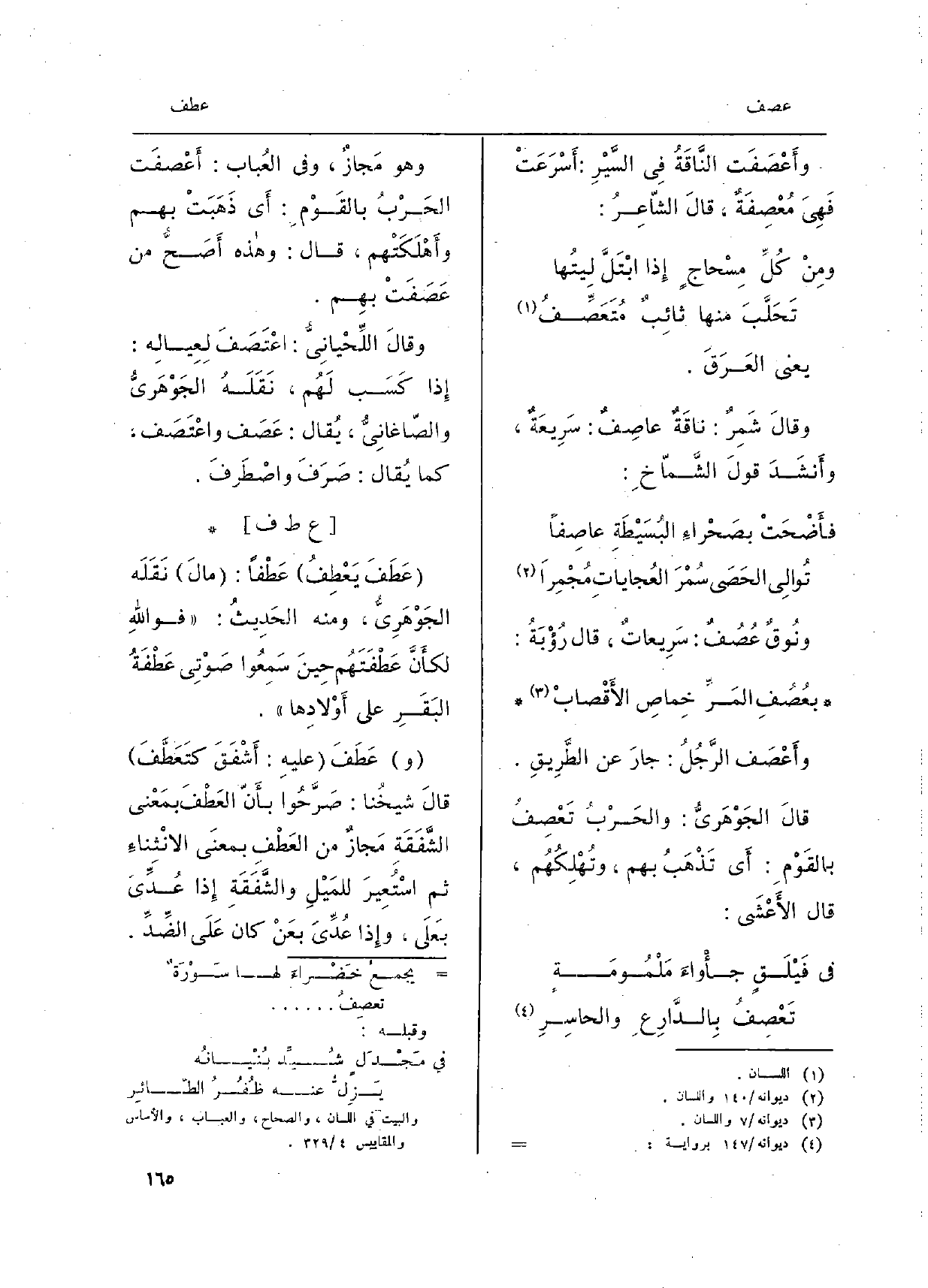 ونُوقٌ عُصُفٌ: سَرِيعاتٌ، قَالَ رُؤْبَةُ: بعُصُفِ المَرِّ خِماصِ الأَقْصابْ وأَعْصَفَ الرّجُلُ: جارَ عَن الطَّرِيقِ. قالَ الجَوْهَرِيُّ: والحَرْبُ تَعْصِفُ بالقَوْمِ: أَي تَذْهَبُ بهم، وتُهْلِكُهُم، قَالَ الأعْشَى:
