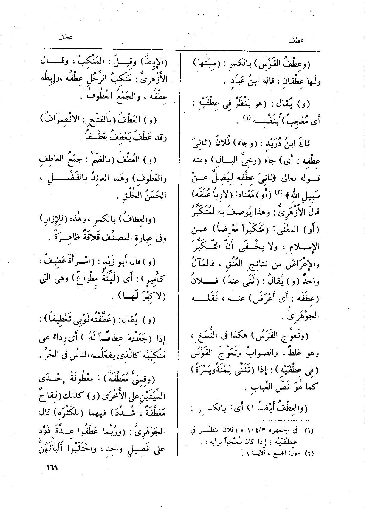 والإِعْراضَ من نتائِجِ العُنُقِ، فالمَآلُ واحدٌ ويُقالُ: ثَنَى عنهُ فلانٌ عِطْفَه: أَي أَعْرَضَ عَنهُ، نَقَله الجوهريُّ. وتَعوَّج الفَرَسُ هَكَذَا فِي النُّسَخِ، وَهُوَ غلطٌ، والصوابُ وتَعَوَّجَ القَوْسُ فِي عِطْفَيْهِ: إِذا تَثَنَّى يَمْنَةً ويَسْرَةً كَمَا هُوَ نَصُّ العُبابِ. والعِطْفُ أَيْضاً أَي: بالكسرِ: الإِبِطُ وقِيلَ: المَنْكِبُ، وَقَالَ الأَزْهريّ: مَنْكِبُ الرَّجُلِ عِطْفُه، وإِبِطُه عِطْفُه، والجَمْعُ العُطُوفِ. والعَطْفُ بالفتحِ: الانْصِرافُ وَقد عَطَفَ يَعْطِفُ عَطْفاً. والعُطْفُ بالضّمِّ: جمْعُ العاطِفِ والعَطُوفِ وهُما العائِدُ بالفَضْلِ، الحَسَنُ الخُلُقِ. والعِطافُ بالكسرِ، وَهَذِه لِلإِزارِ وَفِي عِبارةِ المصنِّف قَلاقَةٌ ظاهِرَةٌ. وَقَالَ أَبو زَيْدٍ: امْرأَةٌ عَطِيفٌ، كأَمِيرٍ: أَي لَيِّنَةٌ مِطْواعٌ وَهِي الَّتِي لَا كِبْرَ لَها. ويُقال: عَطَّفْتُه ثَوْبِي تَعْطِيفاً: إِذا جَعَلْتهُ عِطافاً لَهُ أَي رِداءً على مَنْكِبَيْه كالَّذِي يفعَلُه الناسُ فِي الحَرِّ. وقِسِيٌّ مُعَطَّفَةٌ: معْطُوفَةُ إِحْدَى السِّيَتَيْنِ على الأُخْرَى وَكَذَلِكَ لِقاحٌ مُعَطَّفَةٌ، شُدِّدَ فيهمَا للكَثْرَةِ قَالَ الجَوْهَرِيُّ: ورُبَّما عَطَفُوا عِدَّةَ ذَوْدٍ على فَصِيلٍ واحدٍ، واحْتَلَبُوا أَلْبانَهُنَّ