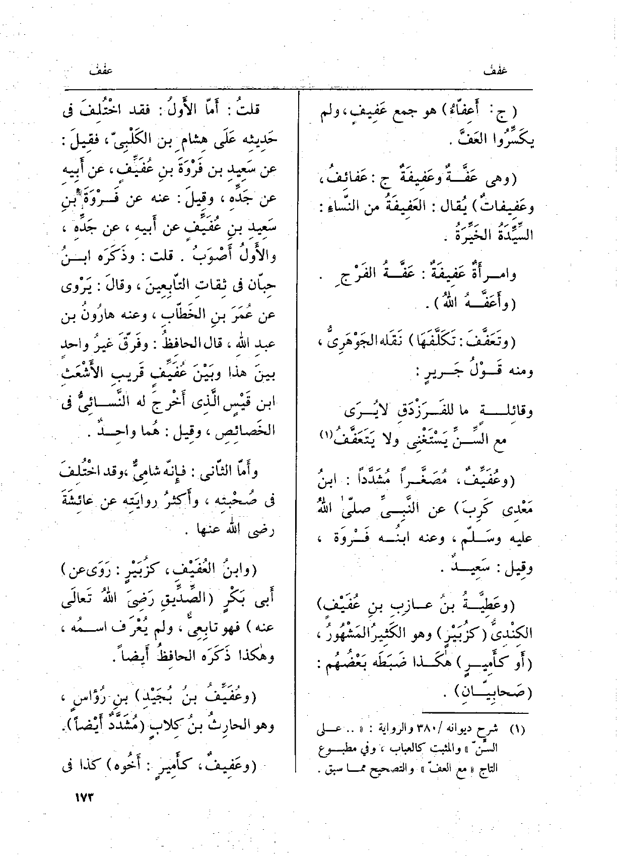 ج: {أَعِفّاءُ هُوَ جمع} عَفِيفٍ، وَلم يكَسِّرُوا {العَفَّ. وَهِي} عَفَّةٌ {وعَفِيفَةٌ ج:} عَفائِفُ، {وعَفِيفاتٌ يُقال:} العَفِيفَةُ من النّساءِ: السِّيدَةُ الخَيِّرَةُ. وامرأَةٌ {عَفِيفَةٌ:} عَفَّةً الفَرْجِ، وأَعَفَّهُ الله. {وتَعَفَّفَ: تَكَلَّفَهَا نَقَله الجَوْهَرِيُّ، وَمِنْه قَول جَريرٍ: