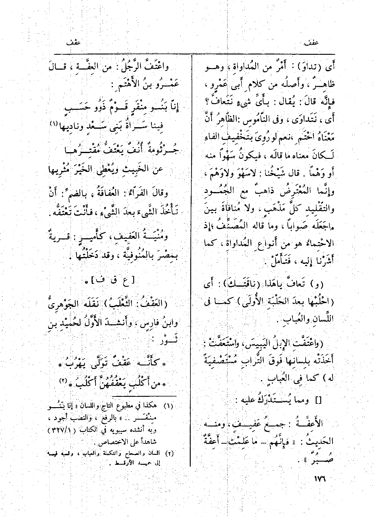 أَي تداوَ: أَمْرٌ من المُداواةِ، وَهُوَ ظاهِرٌ، وأَصلُه من كلامِ أَبي عَمْرٍ و، فإِنَّه قالَ: يُقال: بأَيِّ شيءٍ {نَتَعافَّ أَي، نَتَداوَى، وَفِي النّامُوسِ: الظّاهِرُ أَنَّ) مَعْنَاهُ احْتَمِ، نعم لَو رُوِيَ بتَخْفِيفِ الفاءِ لَكَانَ مَعْنَاهُ مَا قَالَه، فيكونُ سَهْواً مِنْهُ أَو وَهْمَ، وإِنَّما المُعْتَرِضُ ذاهبٌ مَعَ الجُمُودِ والتّقْلِيدِ كلَّ مَذْهَبٍ، وَلَا مُنافاةَ بينَ مَا جَعَله صَواباً، وَمَا قَالَه المُصَنِّفُ، إِذ الاحْتِماءُ هُوَ من أَنواعِ المُداواةِ، كَمَا أَشرْنا إِليه، فتَأَمّلْ. (و) } تَعافَّ يَا هَذا ناقَتَكَ: أَي احْلُبْها بعَدَ الحَلْبَةِ الأُولَى كَمَا فِي اللِّسانِ والعُبابِ. {واعْتَفَّتِ الإِبلُ اليَبِيسَ،} واسْتَعَفَّتْ: أَخَذَتْه بلِسانِها فَوقَ التُّرابِ مُسْتَصْفِيَةً لَهُ كَمَا فِي العُبابِ.