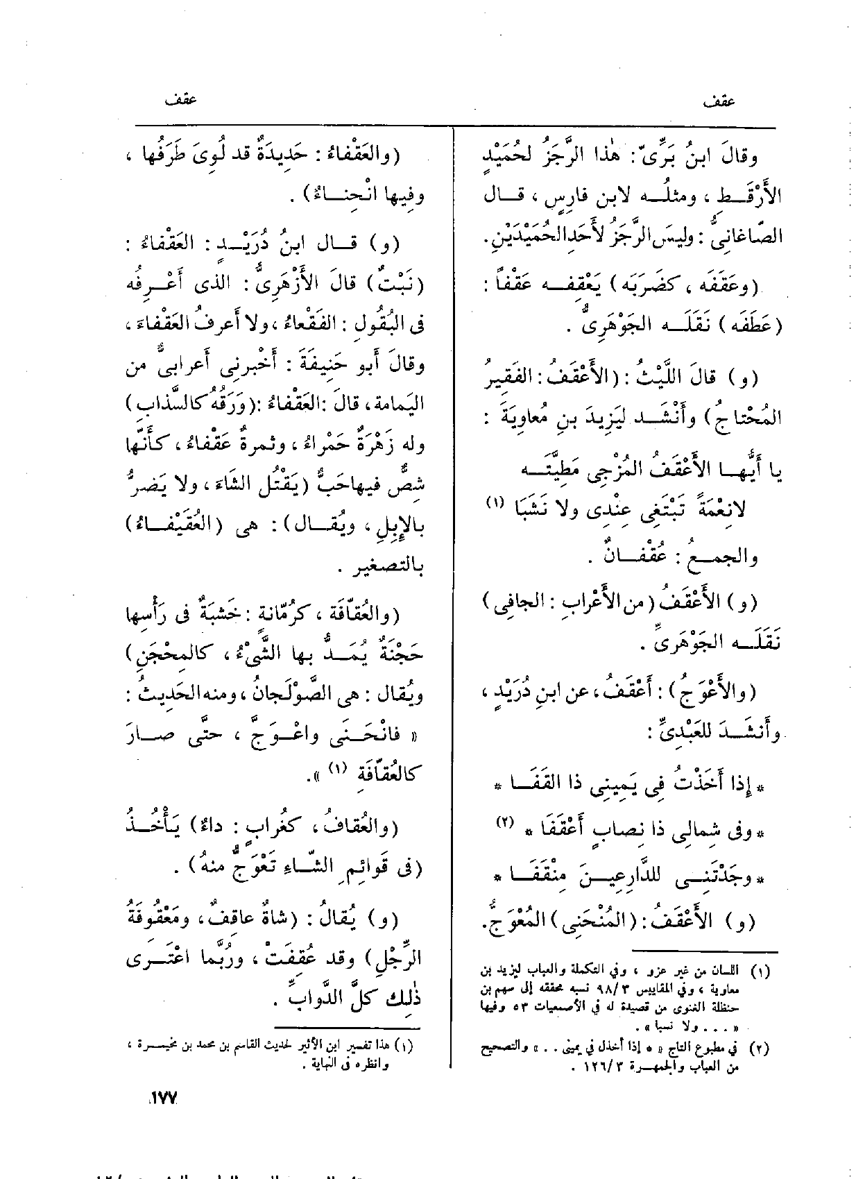 والجمعُ: عُقْفانٌ. والأَعْقَفُ من الأَعْرابِ: الجافِي نَقَلَه الجَوْهَريِّ. والأَعْوَجُ: أَعْقَفُ، عَن ابنِ دُرَيْدٍ، وأَنشَدَ للعَبْدِيِّ: إِذا أَخَذْتُ فِي يَمِينِي ذَا القَفَا وَفِي شِمالِي ذَا نِصابٍ أَعْقَفَا وجَدْتَنِي للدَّارِعينَ مِنْقَفَا)