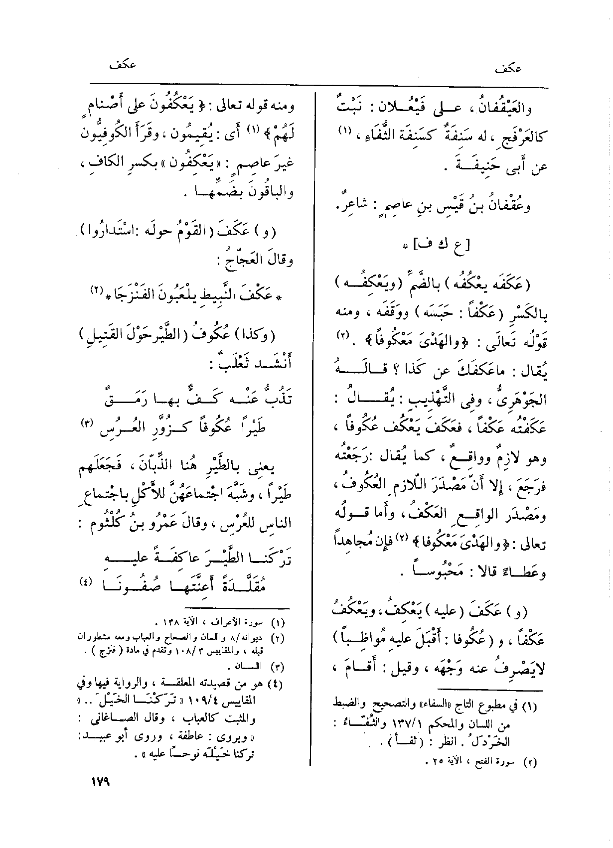 عَكَفَه يعْكُفُه بالضَّمِّ ويَعْكِفُه بالكَسْرِ عَكْفاً: حَبَسَه ووَقَفَه، وَمِنْه قَوْلُه تَعالى: والهَدْيَ مَعْكُوفَاً. يُقال: مَا عَكفَكَ عَن كَذا قالهُ الجوهريُّ، وَفِي التَّهْذِيبِ: يُقَال: عَكَفْتُه عَكْفاً، فَعَكَفَ يَعْكُف عُكُوفاً، وَهُوَ لازِمٌ وواقِعٌ، كَمَا يُقال: رَجَعْتُه فرَجَعَ، إِلا أَنّ مَصْدَرَ اللازمِ العُكُوفِ، ومَصْدَر الواقِعِ العَكْفُ، وأَما قَوله تَعَالَى: والهَدْىَ مَعْكُوفاً فإِن مُجاهِداً وعَطاءً قَالَا: مَحْبُوساً. وعَكَفَ عَلَيْهِ يَعْكِفُ، ويَعْكُفُ عَكْفاً، وعُكُوفاً: أَقْبَلَ عليهِ مُواظِباً لَا يَصْرِفُ عَنهُ وَجْهَه، وَقيل: أَقامَ، وَمِنْه قَوْله تَعَالَى: يَعْكُفُونَ على أَصْنامٍ لهُمْ أَي: يُقِيمُون، وقَرَأَ الكُوفِيُّون غيرَ عاصِمٍ: يَعْكِفُون بِكَسْر الكافِِ، والباقُونَ بضَمِّها. وعَكَفَ القَوْمُ حولَه: اسْتَدارُوا وقالَ العجاجُ: عَكْفَ النَّبِيطِ يلْعَبُونَ الفَنْزَجَا وَكَذَا عُكُفُ الطَّيْر حَوْلَ القَتِيلِ أَنْشَد ثَعْلَبٌ: