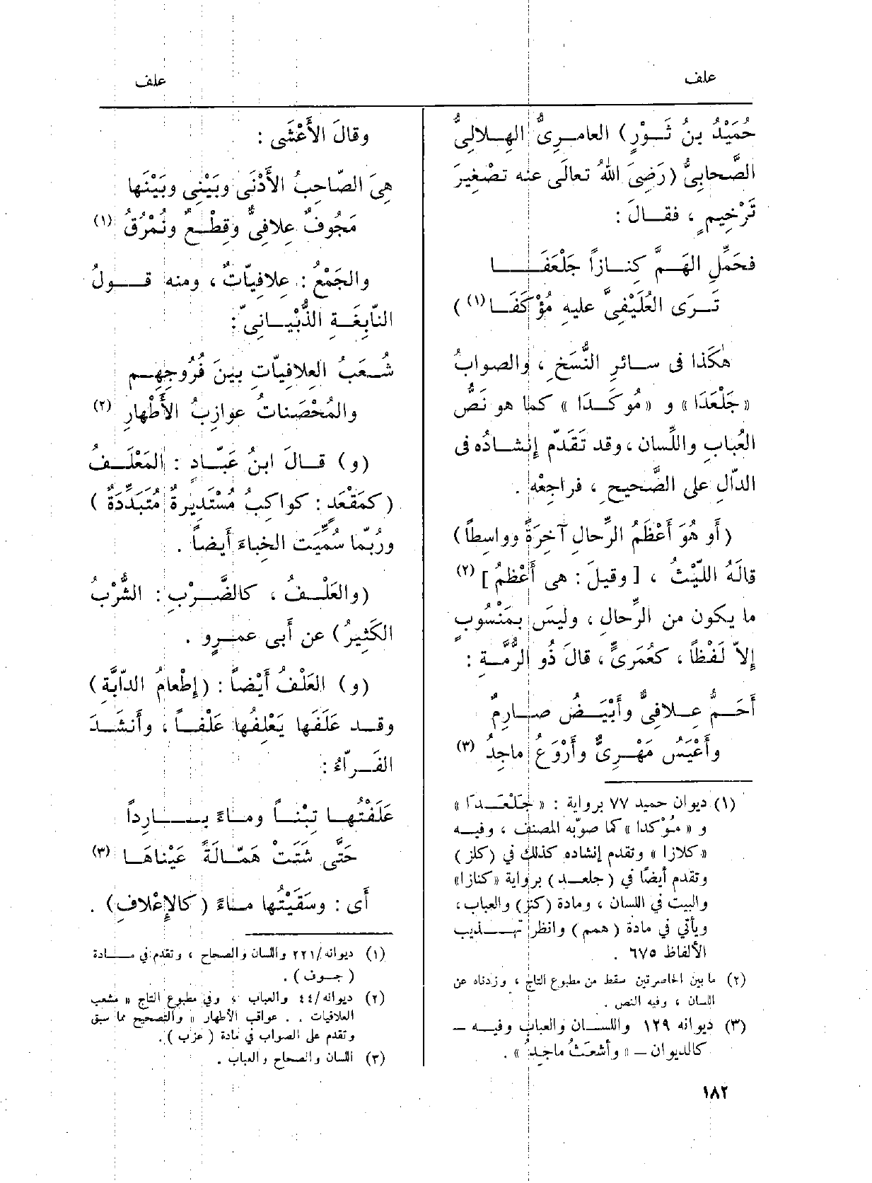 وقالَ الأعْشَى: هِيَ الصّاحِبُ الأَدْنَى وبَيْنِي وبَيْنَهامَجُوفٌ عِلافِيٌّ وقِطْعٌ ونُمْرُقُ والجَمْعُ: علافِيّاتٌ، وَمِنْه قولُ النابِغَةِ الذُّبْيانيِّ:)