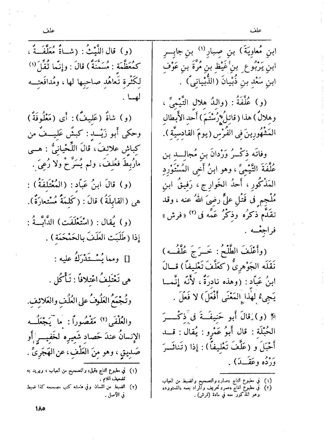 مُعاوِيَةَ بنِ صِبارِ بنِ جابِرِ ابنِ يَرْبُوعِ بنِ غَيْظِ بنِ مُرَّةَ بنِ عَوْفش ابنِ سَعْدِ بنِ ذُبْيانَ الذُّبْيانِيّ. وعُلَّفَةُ: والِدُ هِلالٍ التَّيْمِيِّ، وهِلالٌ هَذَا قاتِلُ رُسْتَمَ أَحدِ الأَبطالِ المَشْهُورِينَ فِي الفُرْسِ يومَ القادِسيَّةِ. وفاتَه ذِكْرُ وَرْدانَ بنِ مُجالِدِ بن عُلَّفَةَ التَّيمِيِّ، وَهُوَ ابنُ أَخِي المُسْتَوْرِدِ المَذْكُورِ، أَحدُ الخَوارِج، رَفِيقُ ابنِ مُرْجِمٍ فِي قَتْلِ عليِّ رَضِي اللهُ عَنهُ، وَقد تقَدَّم ذكرُه وذِكْرُ عَمِّه فِي فرش فراجِعْه. وأَعْلَفَ الطَّلْحُ: خَرَجَ عُلَّفُه نَقَلَه الجَوْهرِيُّ كعَلَّفَ تَعْلِيفاً قالَ ابنُ عَبّادٍ: وَهَذِه نادِرَةٌ، لأَنّه إِنَّما يَجِيءُ لهَذَا المَعْنَى أَفْعَلَ لَا فَعّلَ. وقالَ أَبو حَنِيفَةَ فِي ذِكْرَ الحُبْلَةِ: قَالَ أَبو عَمْرٍ و: يُقال: قد أَحْبَلَ وعَلَّفَ تَعْلِيفاً: إِذا تَناثَرَ وَرْدُه وعَقَدَ: وَقَالَ اللَّيْثُ: شاةٌ مُعَلَّفَةٌ، كمُعَظَّمَةٍ: مُسمَّنَةٌ قالَ: وإِنّما ثُقِّلَ لِكَثْرَةِ تَعاهُدِ صاحِبِها لَهَا، ومُدافَعتِه لَهَا. وشاةٌ عَلِيفٌ: أَي مَعْلُوفَةٌ وَحكى أَبو زَيْدٍ: كبشٌ عَلِيفٌ من كِباشٍ علائِفَ، قالَ اللِّحْيانِيُّ: هِيَ مَا رُبِطَ فعُلِفَ، وَلم يُسَرَّحْ وَلَا رُعِيَ. وقالَ ابنُ عَبّادٍ: المُعْتَلِفَةً: هِيَ القابِلَةُ قالَ: كَلِمَةٌ مُسْتعارَةٌ. ويُقال: اسْتَعْلَفَت الدَّابَّةُ: إِذا طَلَبَت العَلَفَ بالحَمْحَمَةِ.