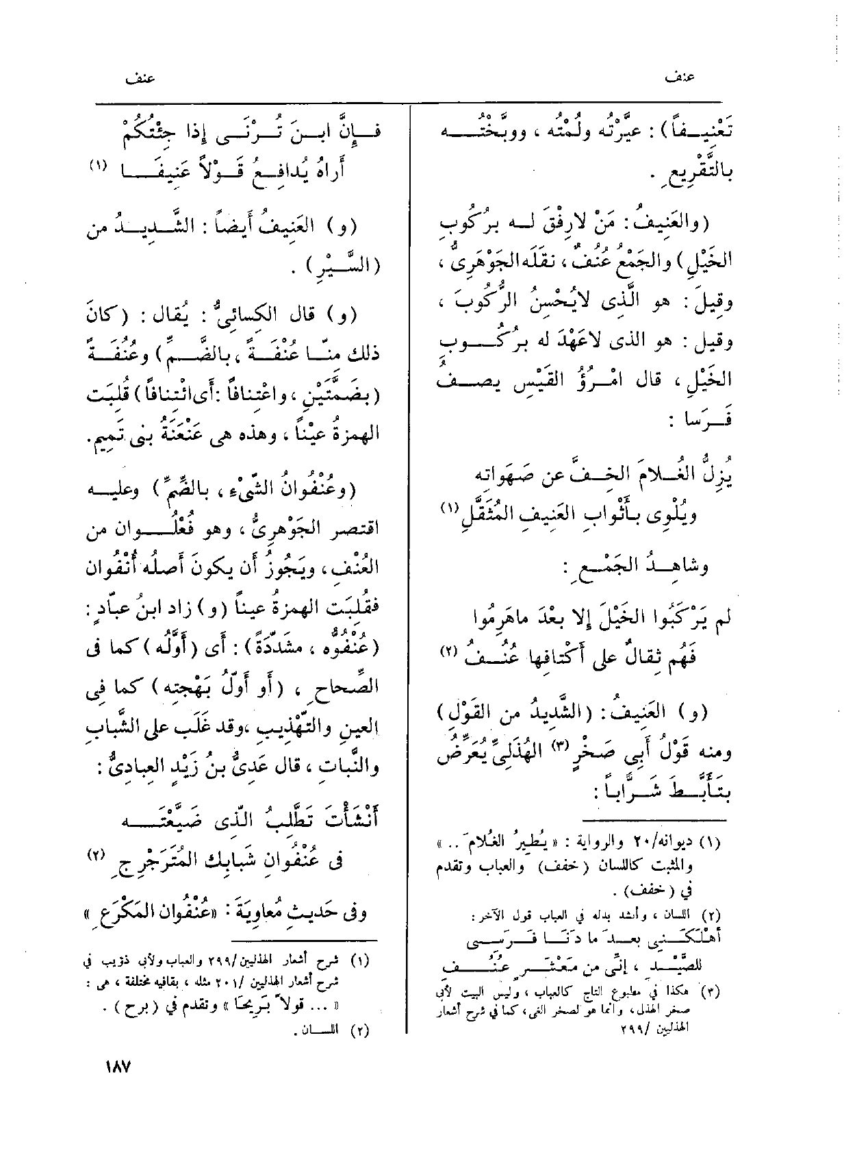 والعَنِيفُ: الشَّدِيدُ من القَوْلِ وَمِنْه قَوْلُ أَبِي صَخْرٍ الهُذَلِيِّ يُعَرِّضُ بتَأَبَّطَ شَرَّاباً: