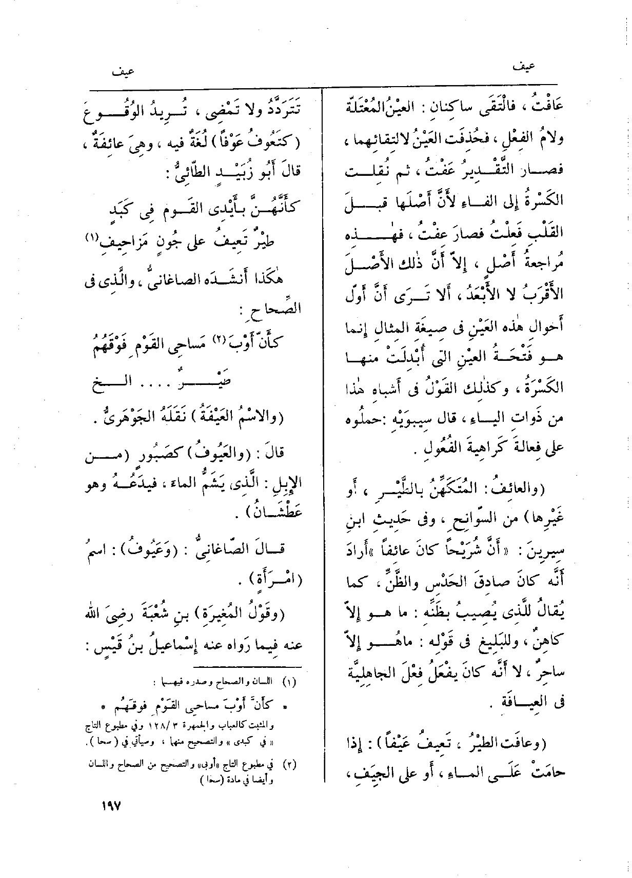 {عَافْتُ، فالْتَقَى ساكِنانِ: العيْنُ المُعْتَلَة ولامُ الفِعْلِ، فحُذِفَت العَيْنُ لَا لتِقائِهما، فَصَارَ التَّقْدِيرُ} عَفْتُ، ثمَّ نُقِلت الكَسْرةُ إِلى الفاءِ لأَنَّ أَصْلَها قبلَ القَلْبِ فَعِلْتُ فصارَ عِفْتُ، فهذهِ مُراجعةُ أَصْلٍ، إِلاّ أَنَّ ذَلِك الأَصْلَ الأَقْرَبُ لَا الأَبْعَدُ، أَلا تَرَى أَنَّ أَوّل أحوالِ هَذِه العَيْنِ فِي صِيغَةِ المِثالِ إِنما هُوَ فَتْحَةُ العْينِ الَّتِي أُبْدِلَتْ مِنْهَا الكَسْرَةُ، وكذلِك القَوْلُ فِي أَشباهِ هَذَا من ذَواتِ الياءِ، قَالَ سِيبوَيْهِ: حملُوه على فِعالةَ كَراهِيةَ الفُعُولِ. {والعائِفُ: المُتَكَهِّنُ بالطَّيْرِ، أَو غَيْرِها من السّوانِحِ، وَفِي حَدِيثِ ابنِ سِيرِينَ: أَنَّ شُرَيْحاً كانَ} عائِفاً أَرادَ أَنَّه كانَ صادقَ الحَدْسِ والظَّنِّ، كَمَا يُقالُ للَّذِي يُصِيبُ بظَنِّهِ: مَا هُوَ إِلاّ كاهِنٌ، وللبَلِيغ فِي قَوْلِه: مَا هُو إِلاّ ساحِرٌ، لَا أَنَّه كانَ يفْعَلُ فِعْلَ الجاهِلِيَّة فِي العِيافَةِ. {وعافَت الطَيْرُ،} تَعِيفُ {عَيْفاً: إِذا حاَمتْ عَلى الماءِ، أَو على الجِيَفِ، تَتَرَدَّدُ وَلَا تَمْضِي، تُرِيدُ الوُقُوعَ} كتَعُوفُ {عَوْفاً لُغَةٌ فِيهِ، وهِيَ} عائِفَةٌ، قالَ أَبو زُبَيْدٍ الطائِيُّ: