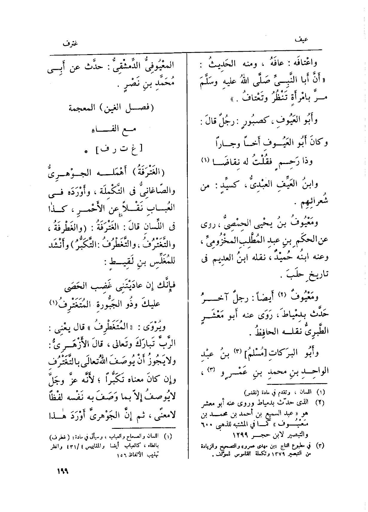 وابنُ {العَيِّفِ العبْدِيُّ، كسيِّدٍ: من شُعرائِهِم.} ومَعْيُوفُ بنُ يحيى الحِمْصِيُّ، روى عَن الحكَمِ بنِ عبد المُطَّلِبِ المخْزُومِيِّ، وَعنهُ ابنُه حُميْدٌ، نَقله ابنُ العدِيم فِي تاريخِ حَلبَ. ومَعْيُوفٌ أَيضاً: رجلٌ آخرُ حَدَّث بدِمْياطَ، رَوَى عَنهُ أَبو مَعْشَرٍ الطَّبَرِيُّ نَقله الحافِظُ. وأَبُو البرَكاتِ مُسْلمُ بنُ عبْدِ الواحِدِ بنِ محمدِ بنِ عَمْرٍ و،! - المعْيُوفيُّ الدِّمشْقِيُّ: حدَّث عَن أَبِي مُحَمَّدِ بنِ نَصْرٍ.