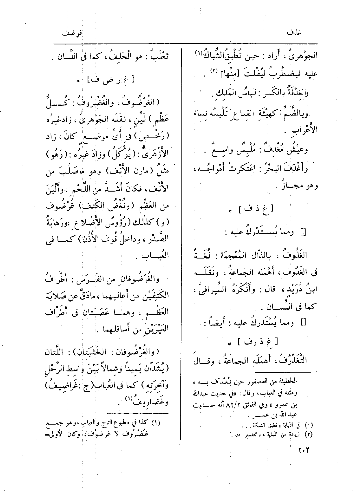 الغُرْضُوفُ، والغُضْرُوفُ: كُلُّ عَظْمٍ لَيِّنٍ، نقَلَه الجَوْهريُّ، زَاد غيرُه رَخْص فِي أَيِّ موضعٍ كانَ، زَاد الأَزْهَريُّ: يُؤْكَلُ وزادَ غيرُه: وَهُوَ مثْلُ مارن الأَنْف وَهُوَ مَا صَلُبَ من الأَنْف، فكانَ أَشَدَّ من اللَّحْمِ، وأَلْيَنَ من العَظْم ونُغْضُ الكَتف غُرْضُوف وَكَذَلِكَ رُؤُسُ الأَضْلاعِ، ورَهابَةُ الصَّّدْر، وداخلُ قُوف الأُذُن كَمَا فِي العُباب. والغُرْضُوفانِ من الفَرَس: أَطْرافُ الكَتِفَيْن من أَعاليهما، مَا دَقَّ عَن صَلابَة العَظْمِ، وهما عَصَبَتان فِي أَطْراف العَيْرَيْنِ من أَسافلهما.