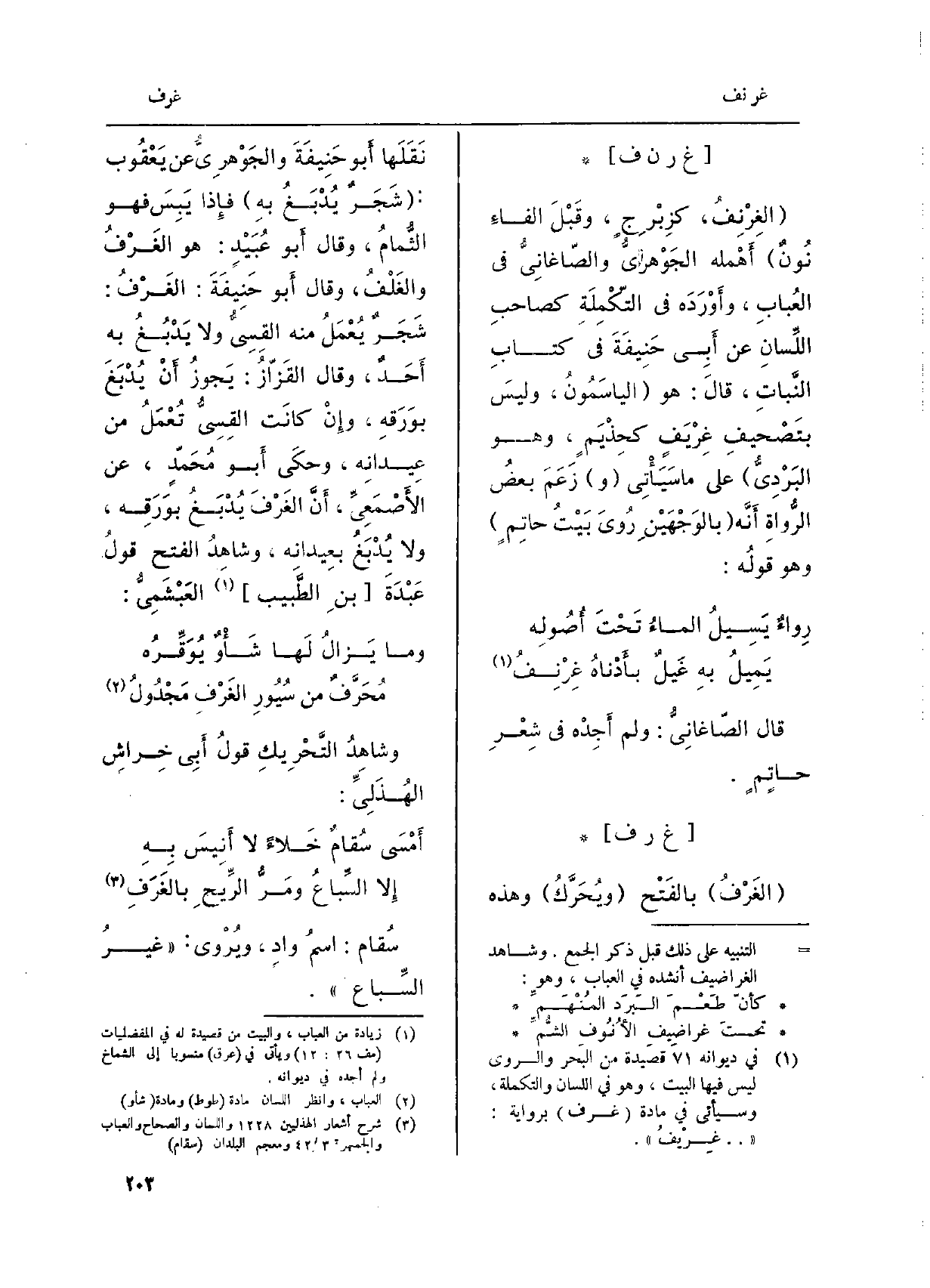 الغَرْفُ بالفَتْح ويُحَرَّكُ وَهَذِه نَقَلَها أَبو حَنيفَةَ والجَوْهرِيُّ عَن يَعْقُوب: شَجَرٌ يُدْبغُ بهِ فإِذا يَبِسَ فَهُوَ الثُّمامُ، وَقَالَ أَبو عُبَيْدٍ: هُوَ الغَرْفُ والغَلْفُ، وَقَالَ أَبو حَنِيفَةَ: الغَرْفُ والغَلْفُ، وَقَالَ أَبو حَنِيفَةَ: الغَرْفُ: شَجَرٌ يُعْمَلُ مِنْهُ القِسِيُّ وَلَا يَدْبُغُ بِهِ أَحدٌ، وَقَالَ القَزّازُ: يَجوزُ أَنْ يُدْبَغَ بوَرَقهِ، وإِنْ كانَت القِسِيُّ تُعْمَلُ من عِيدانِه، وحكَى أَبو مُحَمّدٍ، عَن الأَصْمَعِيِّ، أَنَّ الغَرْفَ يُدْبَغُ بوَرَقِه، وَلَا يُدْبَغُ بعِيدانِه، وشاهِدُ الْفَتْح قولُ عَبْدَةَ بنِ الطّبيب العَبْشَمِيُّ: