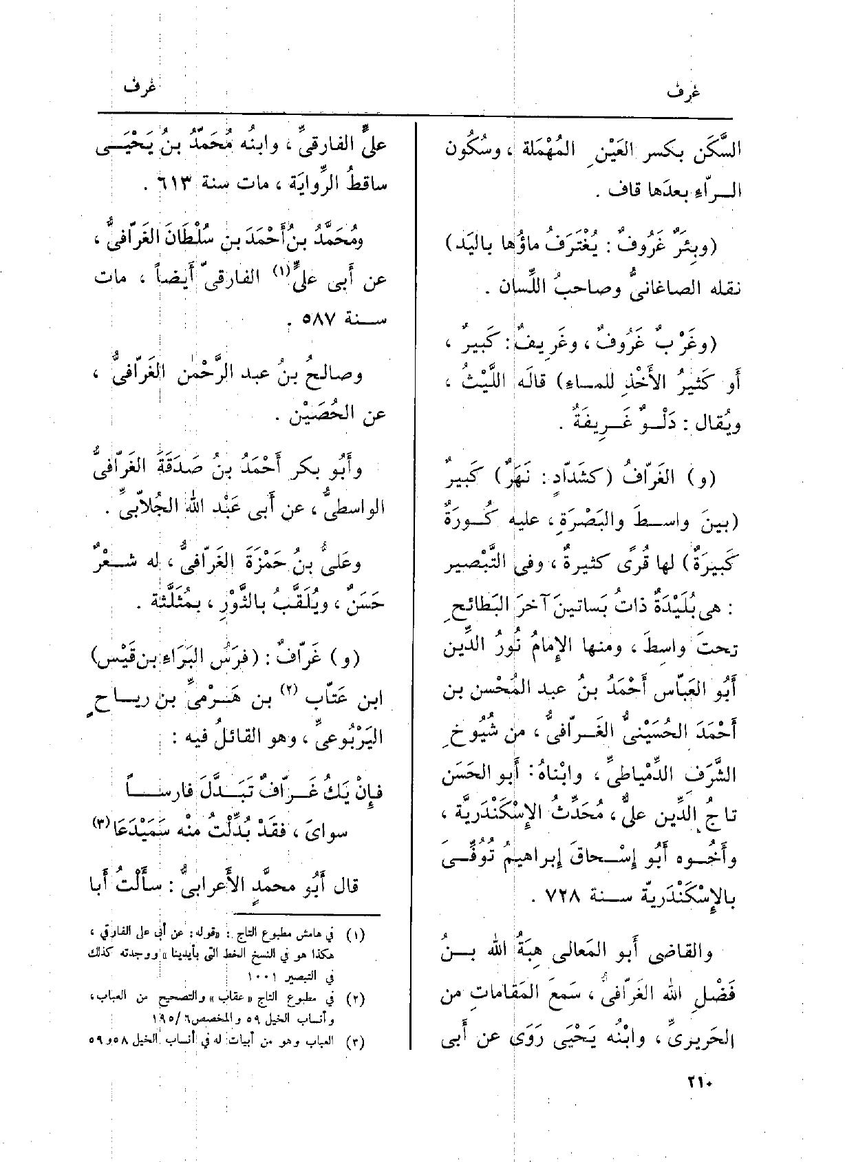 السَّكَن بِكَسْر العَيْنِ الْمُهْملَة، وَسُكُون الرَّاء بعْدهَا قَاف. وبِئَرٌ غَرُوفٌ: يُغْتَرَفُ ماؤُها باليَد نَقله الصاغانيُّ وصاحبُ اللِّسان. وغَرْبٌ غَرُوفٌ، وغَرِيفٌ: كَبيرٌ، أَو كَثيرُ الأَخْذِ للماءِ قَالَه اللَّيْثُ، ويُقال: دَلْوٌ غَرِيفَةٌ. والغَرّافُ كشَدّادٍ: نَهَرٌ كَبيرٌ بينَ واسطَ والبَصْرَةِ، عَلَيْهِ كُورَةٌ كَبيرَةٌ لَهَا قُرًى كثيرةٌ، وَفِي التَّبْصير: هِيَ بُلَيْدَةٌ ذاتُ بَساتينَ آخرَ البَطائحِ تحتَ واسِطَ، وَمِنْهَا الإِمامُ نُورُ الدِّين أَبُو العَبّاس أَحْمَدُ بنُ عبد المُحْسن بن أَحْمَدَ الحُسَيْنيُّ الغَرّافيُّ، من شُيُوخِ الشَّرَفِ الدِّمْياطيِّ، وابْناهُ: أَبو الحَسَن تاجُ الدِّين عليٌّ، مُحَدِّثُ الإِسْكَنْدَريَّة، وأَخُوه أَبُو إِسْحاقَ إِبراهيمُ تُوُفِّيَ بالإسْكَنْدَريّة سنة. وَالْقَاضِي أَبُو المَعالي هِبَةُ الله بنُ فَضْلِ الله الغَرّافيُّ، سَمَع المَقاماتِ من الحَريريِّ، وابْنُه يَحْيَى رَوَى عَن أَبي عليِّ الفارقيِّ، وابنُه مُحَمّدُ بنُ يَحْيَى ساقطُ الرِّوايَة مَاتَ سنة. ومُحَمَّدُ بنُ أَحْمَدَ بن سُلْطاَنَ الغَرّافيُّ، عَن أَبي عليٍّ الفارقيّ أَيضاً، مَاتَ سنة. وصالحُ بنُ عبد الرَّحْمن الغَرّافيُّ، عَن الحُصَيْن. وأَبُو بكر أَحْمَدُ بنُ صَدَقَةَ الغَرّافيُّ الواسطيُّ عَن أَبي عَبْد الله الجُلاّبيِّ. وعَليُّ بنُ حَمْزَةَ الغَرّافيُّ، لَهُ شعْرٌ حَسَنٌ، ويُلَقَّبُ بالثَّوْرِ، بمُثَلَّثة. وغَرّافٌ: فَرَسُ البَرَاءِ بن قَيْس ابْن عَتّاب بن هَرْميِّ بن رياحٍِ اليَرْبُوعيِّ، وَهُوَ القائلُ فِيهِ: