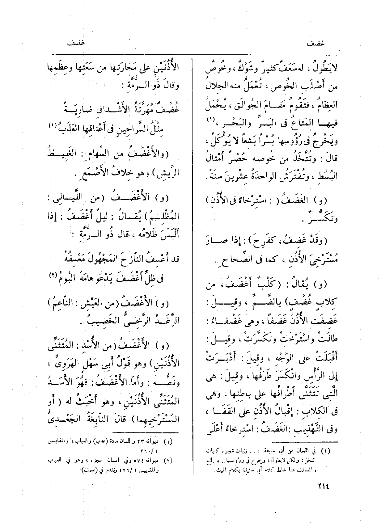 لَا يَطُولُ، لَهُ سَعَفٌ كثيرٌ وشَوْكٌ، وخُوصٌ من أَصْلَبِ الخُوص، تُعْمَلُ مِنْهُ الجِلالُ العِظامُ، فتَقُومُ مَقامَ الجُوالَق، يُحْمَلُ فِيهَا المَتاعُ فِي البَرِّ والبَحْر، ويَخْرجُ فِي رُؤُوسها بُسْراً بَشِعاً لَا يُؤْكَلُ، قَالَ: وتُتَّخَذُ من خُوصه حُصْرٌ أَمْثالُ البُسًطِ، وتُفْتَرَشُ الواحدَةُ عِشْرينَ سنَةً. والغَضَفُ: اسْتِرْخاءٌ فِي الأُذُنِ وتَكَسُّرٌ. وقَدْ غَضِفُ، كفَرِحَ: إِذا صارَ مُسْتَرْخِيَ الأُذُنِ: كَمَا فِي الصِّحاح. ويُقالُ: كَلْبٌ أَغْضَفُ، من كِلابٍ غُضْفٍ بالضَّمِّ، وقِيلَ: غَضِفَت الأُذُنُ غَضَفاً، وَهِي عَضْفاءُ: طالَتْ واسْتَرخَتْ وتَكَسَّرَتْ، وقِيلَ: أَقْبَلَتْ على الوَجْهِ، وقِيلَ: أَدْبَرَتْ إِلى الرَّأْسِ وانْكَسَرَ طَرَفُها، وقِيلَ: هِيَ الَّتِي تَتَثَنَّى أَطْرافُها على باطِنِها، وَهِي فِي الكِلابِ: إِقْبالُ الأُذُنِ على القَفَا، وَفِي التَّهْذِِيبِ: الغَضَفُ: اسْتِرخاءُ أَعْلَى الأُذُنَيْنِ على مَحارَتِها من سَعَتِها وعِظَمِها وقالَ ذُو الرُّمَّةِ: