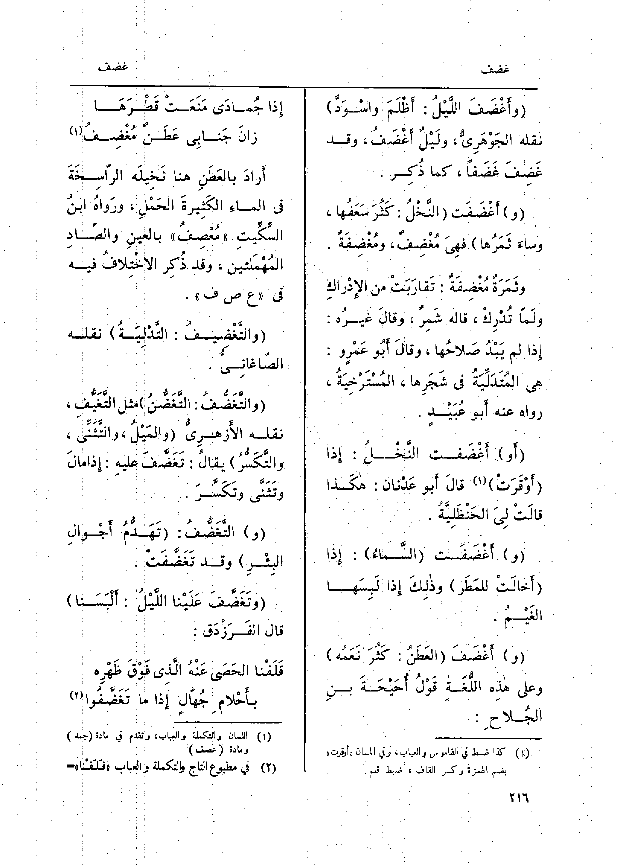 أَرادَ بالعَطَنِ هُنَا نَخِيلَه الرّاسِخَةَ فِي الماءِ الكَثِيرةَ الحَمْلِ، ورَواهُ ابنُ السِّكِّيتِ مُعْصِفُ بالعينِ والصادِ المُهْمَلتين، وَقد ذُكِر الاخْتِلافُ فِيهِ فِي ع ص ف. والتَّغْضِيفُ: التَّدْلِيَةُ نَقله الصّاغانِيُّ.