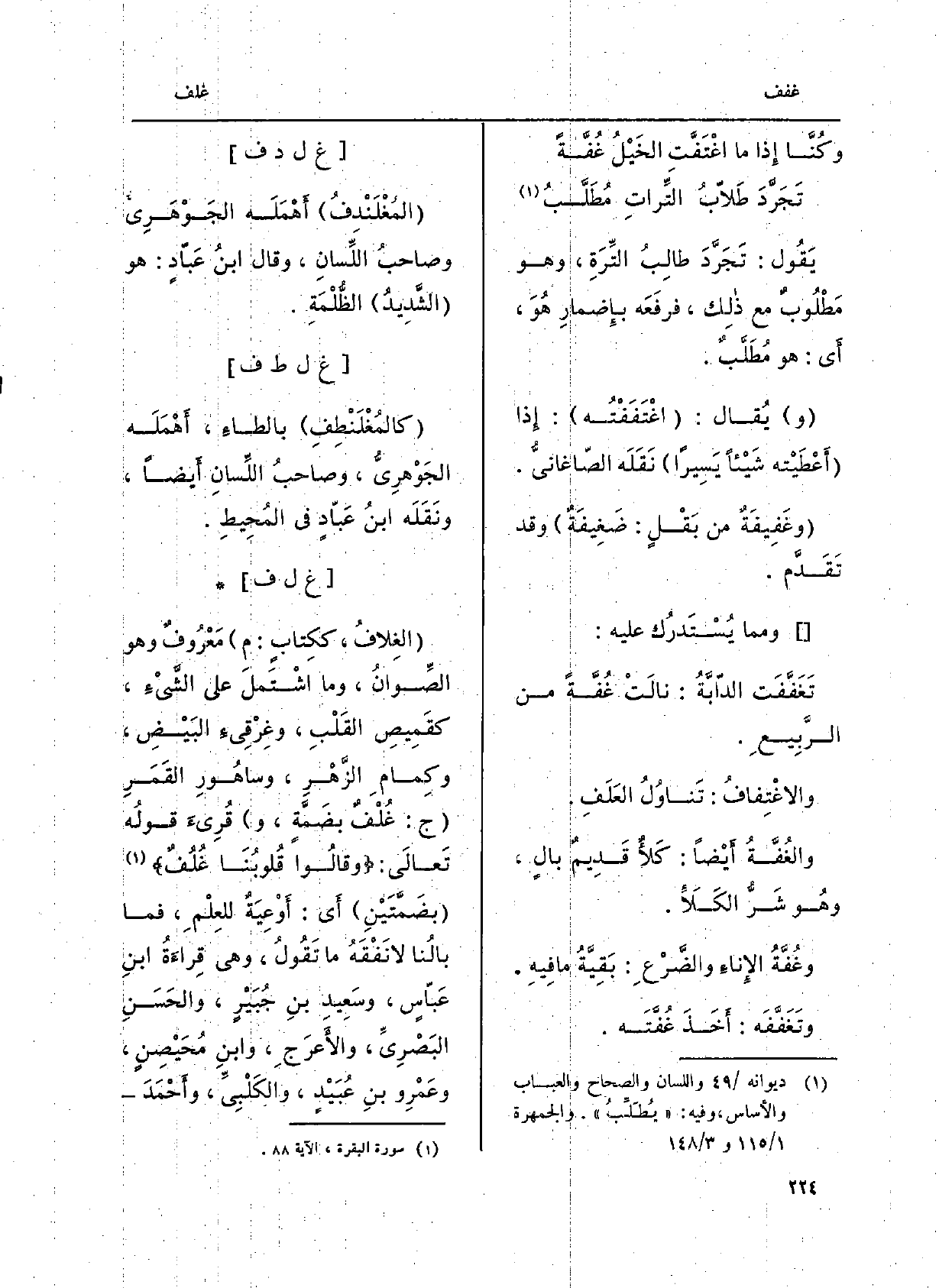 الغِلافُ، ككِتابٍ: م مَعْرُوفٌ وَهُوَ الصِّوانُ، وَمَا اشْتَمَلَ على الشيءِ، كقَمِيصِ القَلْبِ، وغِرْقِئ البَيْضِ، وكِمام الزَّهْرِ، وساهُورِ القَمَرِ ج: غُلْفٌ بضَمَّةٍ، وقُرِئَ قَوْله تَعَالَى: وقالُوا قُلوبُنا غُلُفٌ بِضَمَّتَيْنِ، أَي أَوْعِيَةٌ للعِلْمِ فَمَا بالُنا لَا نَفْقَهُ مَا نَقُولُ، وَهِي قِراءةُ ابنِ عَبَّاس، وَسَعِيد بن جُبَيرٍ، والحسنِ البَصْرِيِّ، والأَعرَجِ، وابنِ مُحيْصنٍ وعَمْرِو بنِ عُبَيْدٍ، والكَلْبِيِّ، وأَحمد